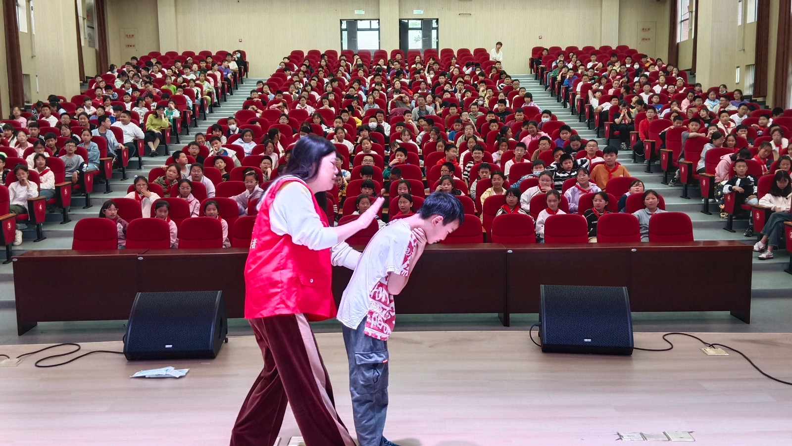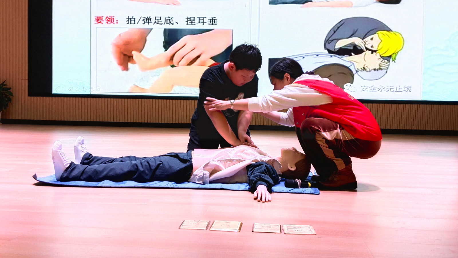 学生们认真听讲,积极互动,现场氛围浓厚。演示结束后,学生们踊跃参与实践,纷纷上台动手操作,陶金枝耐心指导学生如何正确的操作,让参加活动的学生对急救有了更真实的体验与感受。
