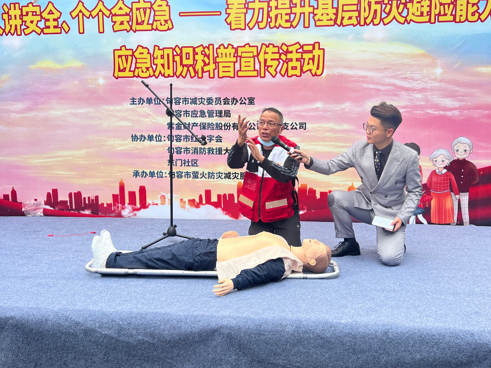 句容市红十字会应急救援队还向现场居民讲解应急救护知识,并利用模拟教学假人,传授心肺复苏术等应急救护技能。