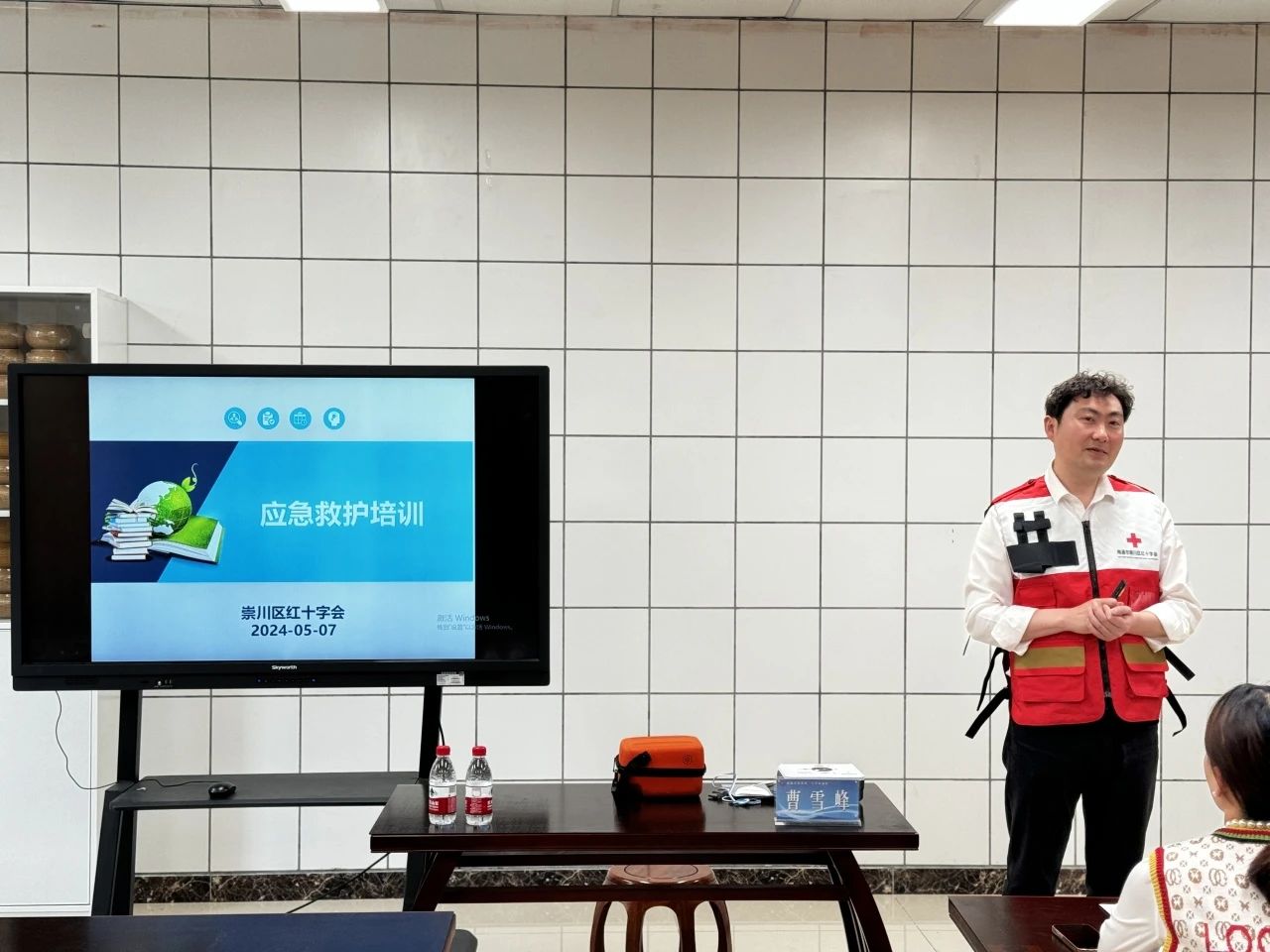5月7日, 张謇一小邀请崇川区红十字卫健委医政科科长曹雪峰为张謇一小的教师们做应急救护培训讲座,旨在提高师生在紧急情况下的自救和互救能力。此次讲座内容涵盖了气道异物梗阻的现场处理、自动体外除颤器(AED)的操作以及心肺复苏(CPR)三个关键部分。
