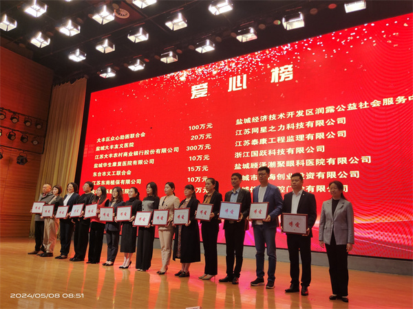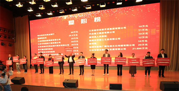 现场发布了“江苏博爱光明行”“苏护行动AED计划”“守护民间救援勇士”“关爱相髓”“红十字爱心洗衣坊”多个爱心筹资项目,盐城市29家爱心单位和个人现场举牌捐赠,捐款1165.1万元,捐物46.376万元。省红十字会党组成员、副会长陆红,市政府副市长、市红十字会会长李兰翔为爱心企业和个人颁发博爱奖牌。