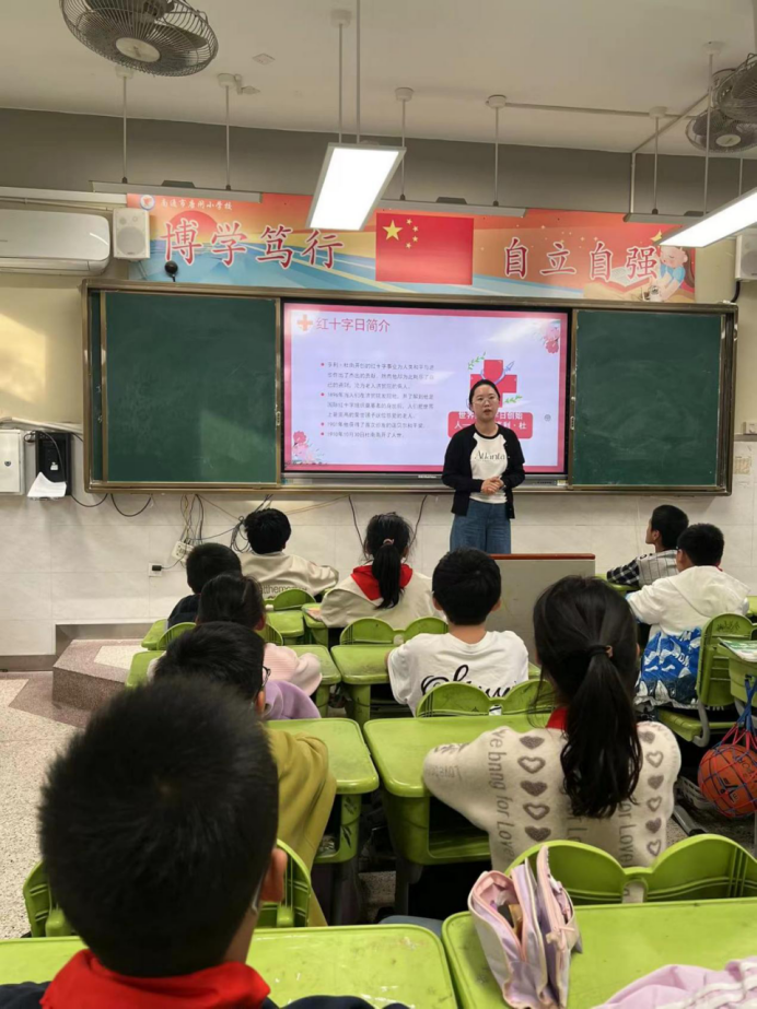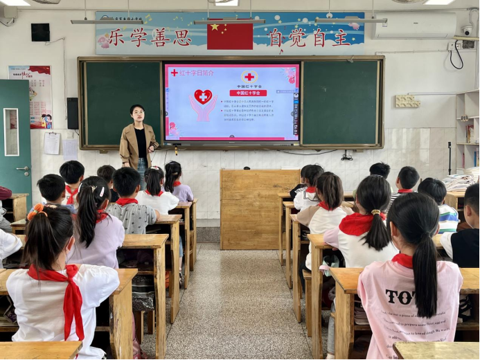 各班召开主题班会,班主任结合图片、视频资料,讲解“世界红十字日”的起源、历史,引导少先队员从小学会关爱集体和他人,及时向需要帮助的人伸出无私援助之手,做乐于奉献的人,还向队员们介绍了中暑、鼻出血、食物中毒等紧急情况的处置办法。