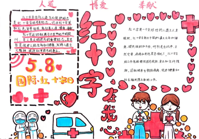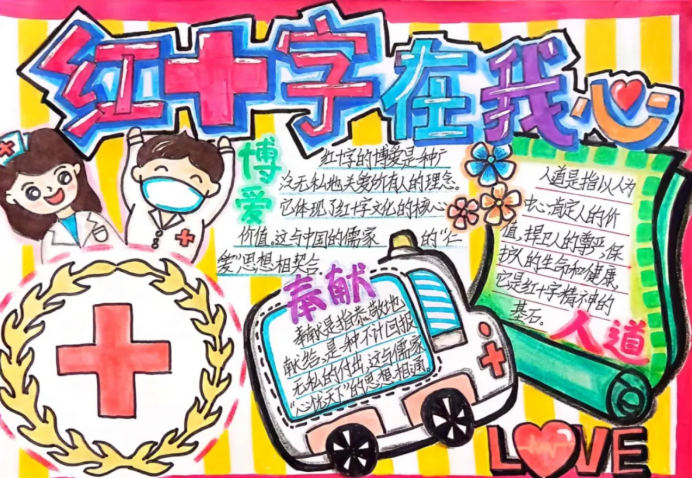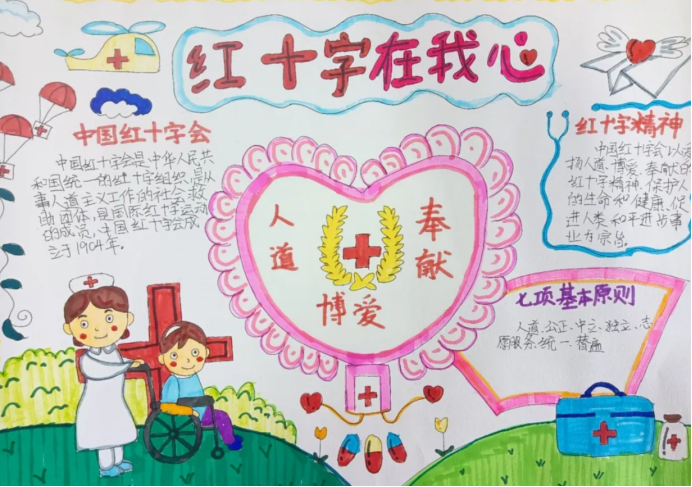同学们还围绕主题,充分利用网络、书籍等途径收集有关红十字的知识,绘制出了一幅幅设计新颖、个性鲜明、内容丰富的海报和手抄报。