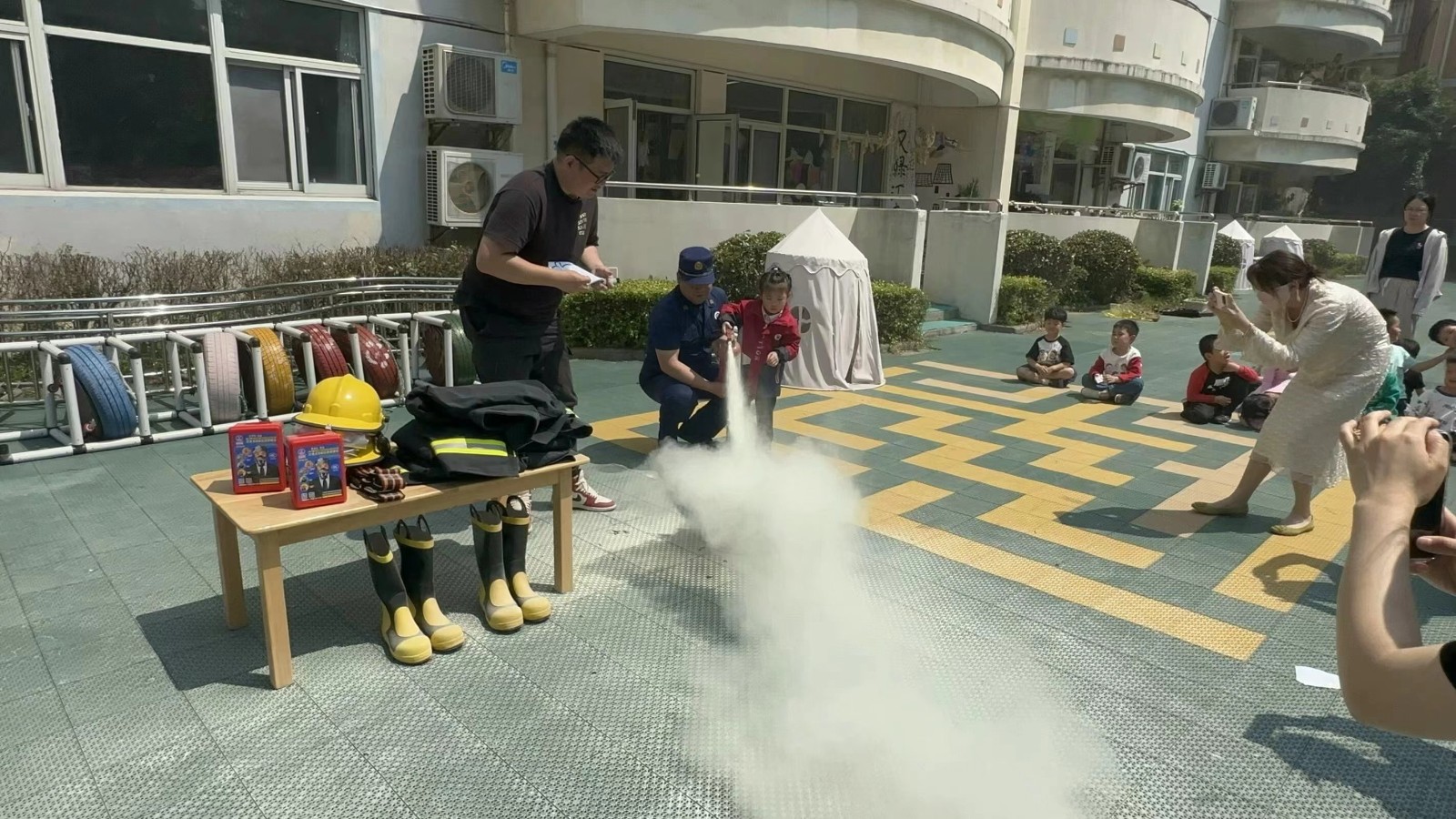 演练开始前,红十字会志愿者与消防安全员向全园宣讲消防安全知识和自救办法,如何紧急逃生的基本消防常识。演练开始后,红十字志愿者和幼儿园老师引导带领孩子们用打湿的毛巾捂住口鼻,弯下腰身,有序地进行疏散。最后,社区红十字会安全负责人员和消防安全员向老师、孩子们具体讲解展示灭火器的使用要点及方法,就灭火器使用四步法“一提、二拔、三瞄、四压”进行实际操练,除灭火器的使用要点外,安全员还耐心细致地讲解了火灾的危害和遇到火灾后正确的应对方法,以及除灭火器外其他的消防器材,如防烟面罩、安全服穿脱方式等,帮助大家熟练掌握灭火技巧,现场气氛热烈。