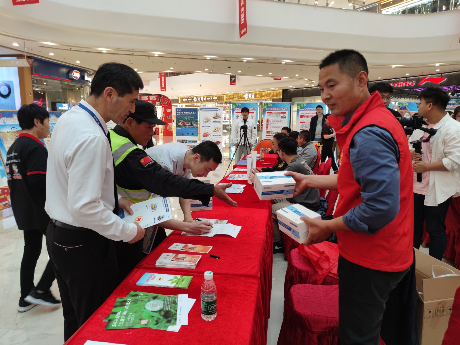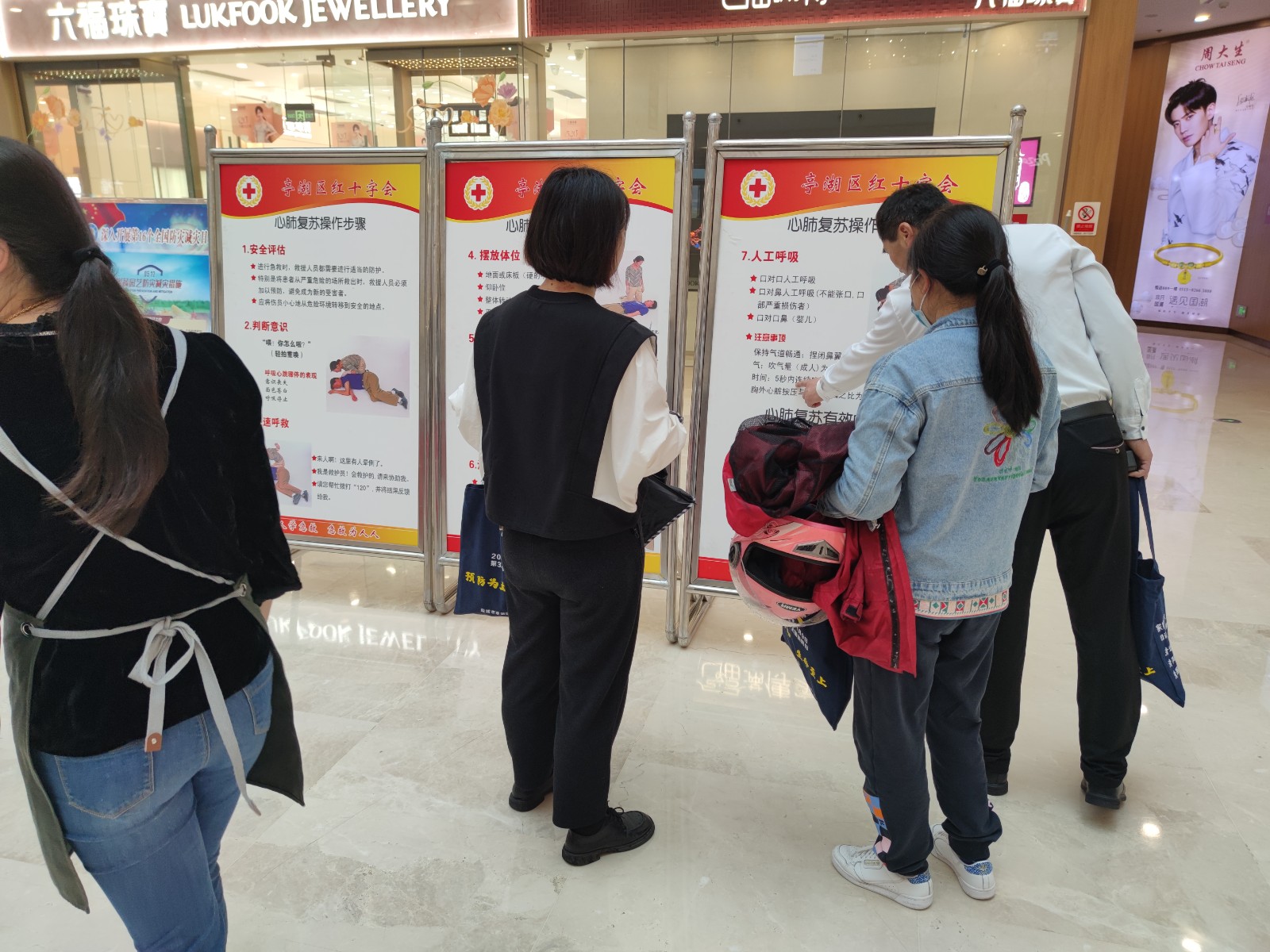 在悦达889商业综合体活动现场,区红十字会设置“三救”(应急救护、应急救援、人道救助)“三献”(无偿献血、造血干细胞捐献、遗体和人体器官捐献)知识展板区,应急救护培训师向大家讲解应急救护知识,详细介绍心肺复苏术、海姆立克急救法、止血包扎和AED的使用等应急救护技能。红十字志愿者分发应急救护手册,并为有意愿参加红十字应急救护培训的市民做好登记服务。