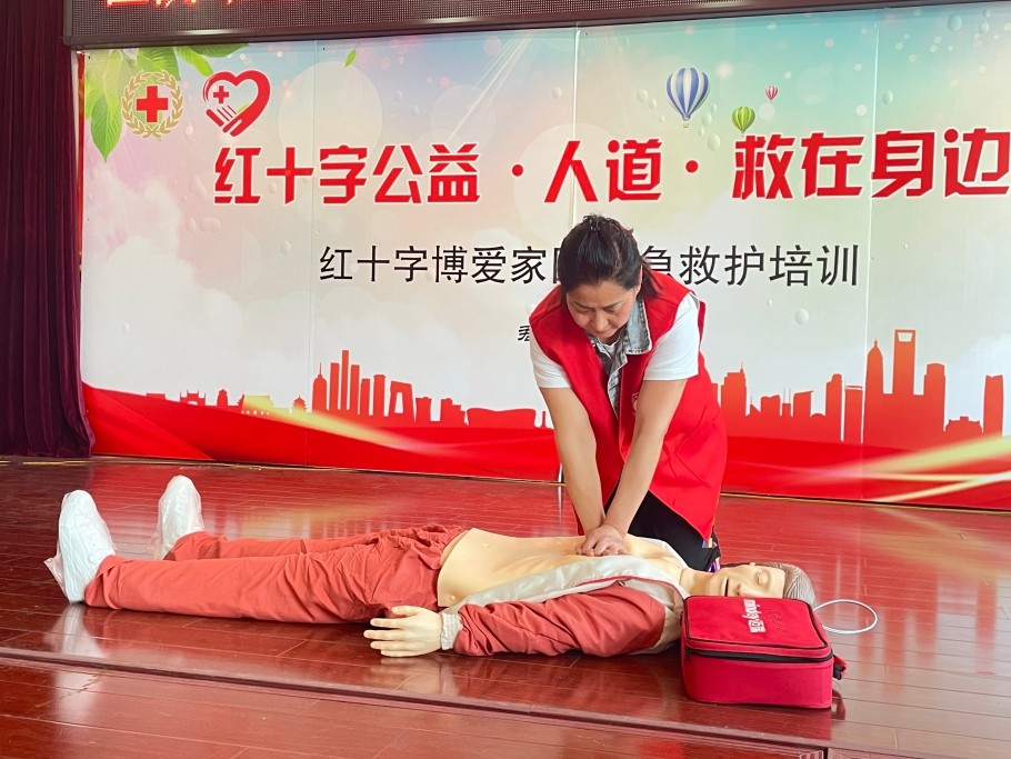 开培训 学救护——红十字“救”在你身边。君山社区积极开展应急救护“救在身边”应急救护培训,开设应急救护课堂,提升自救能力,邀请红十字黄老师为红十字注册志愿者讲解心肺复苏(CPR+AED)应急救护知识宣讲与现场实操培训,发放应急救护宣传手册300余份,大大提升社区工作人员及志愿者对应急救护知识的知晓率,提升非医疗专业人员在突发生命健康安全事件中的应急救护能力和水平。