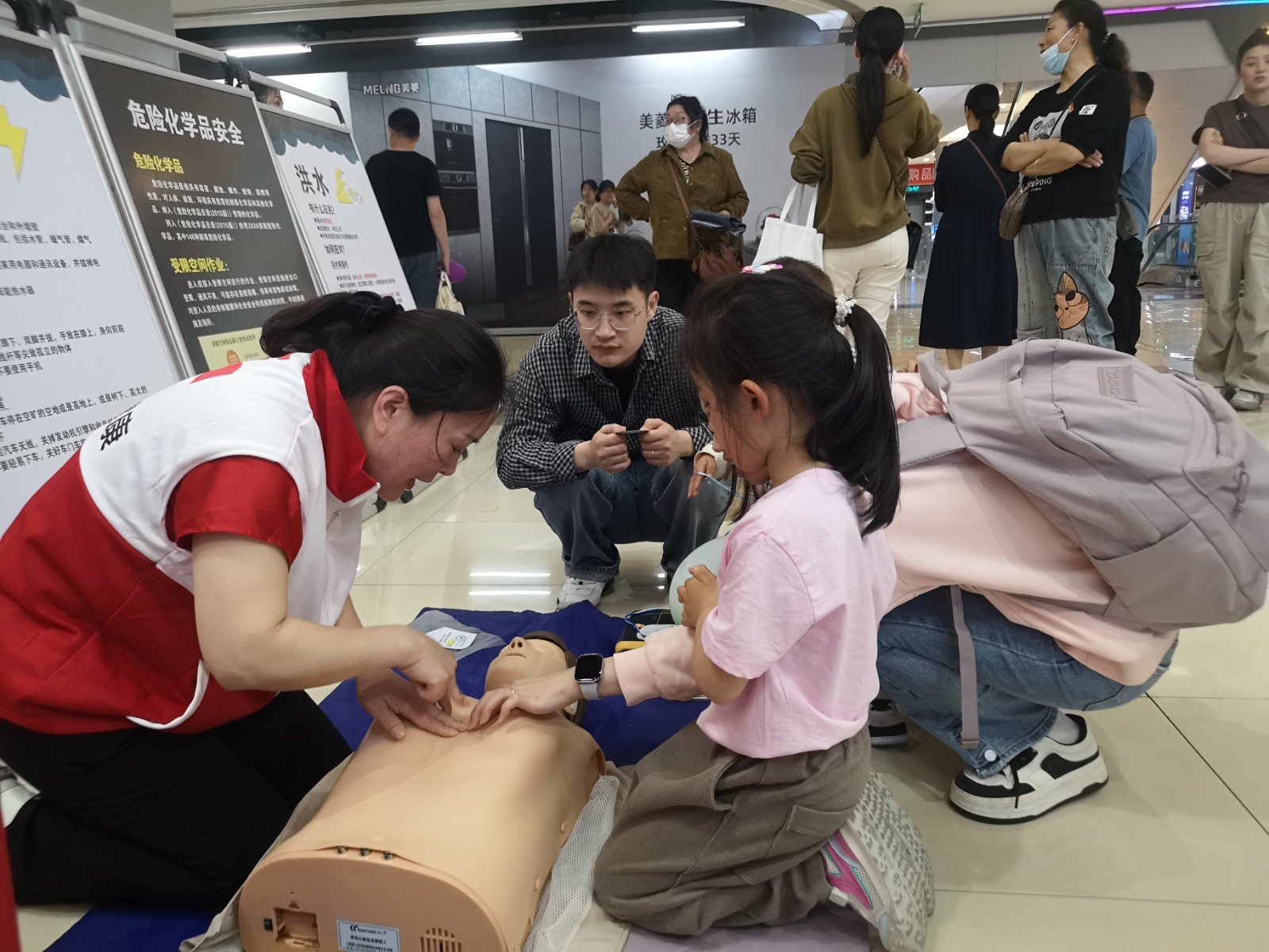 活动现场红十字志愿者应急救护讲师为居民细心地讲解了心肺复苏、海姆立克急救等急救技能,现场邀请市民参与练习并详细解答现群众的所提问题。