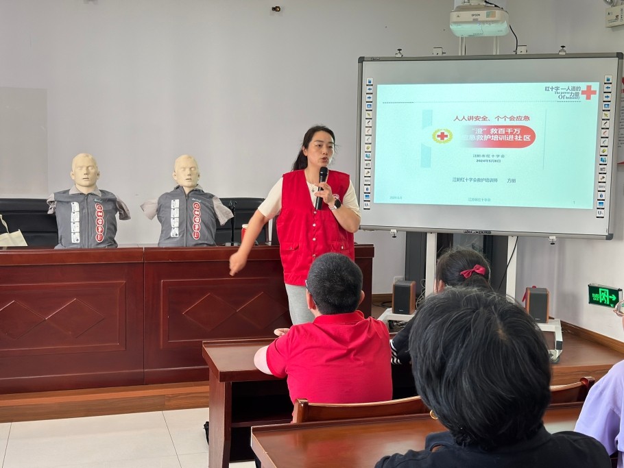 普及急救技巧 守护生命安全。守护生命,“救” 在身边。为提高在校学生及社区居民的安全意识、掌握急救技能,提高应对突发事件的自救互救能力,施元社区邀请江阴职业技术学院方丽老师进行“急救技能培训”主讲。方丽采用理论知识与实际操作相结合的形式,向大家介绍心肺复苏(CPR)、自动体外除颤器(AED)、气道异物梗阻、突发事件处置等理论知识;利用模拟人道具现场传授心肺复苏等基本救护技巧和操作方法,通过整个系列的培训及实践,增强学生和居民在面对各类灾害时抵御风险的能力。