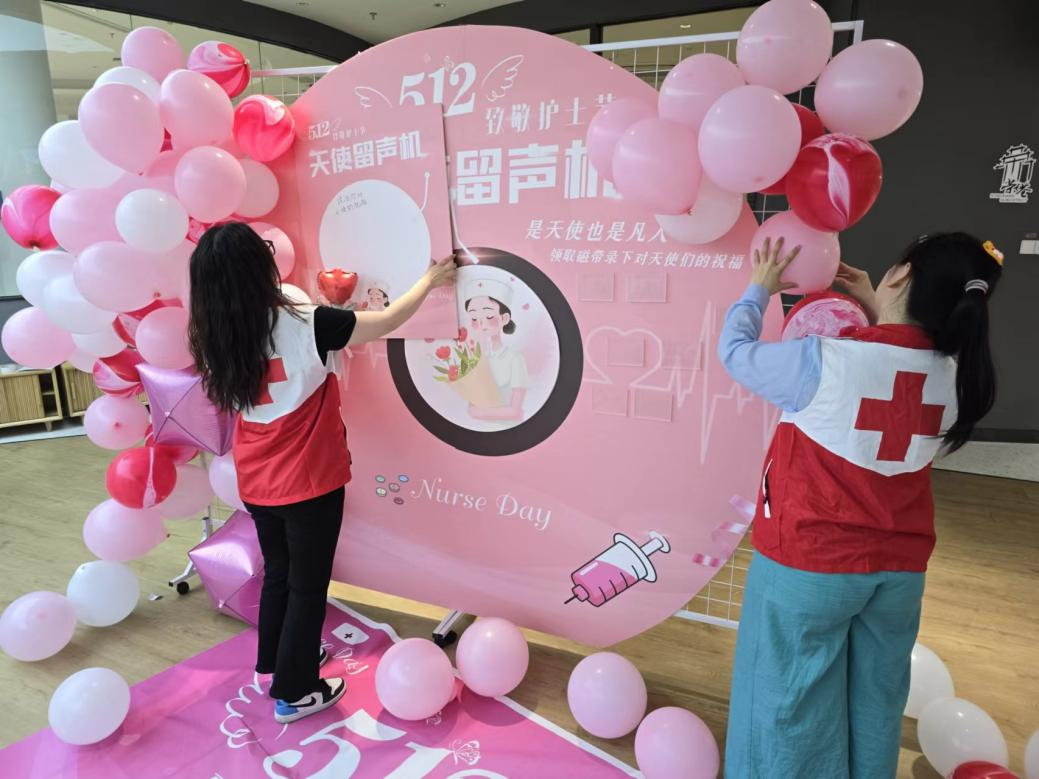 活动现场,红十字志愿者们协助荣巷街道社区卫生服务中心的护士们一起布置道具,为活动营造出温馨而热烈的氛围。他们忙碌的身影穿梭于场地之间,搬运着各种装饰品和设备,精心布置每一个细节。彩带、气球和横幅被巧妙地布置在会场四周,营造出节日般的喜庆气氛。