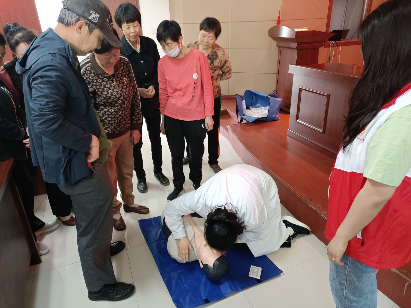 多一分急救知识,多一分生命保障。培训会上红十字师资孙丹先为居民们讲授了心肺复苏、海姆立克急救法、AED操作使用注意事项等急救理论知识,随后现场为大家展示了胸外按压、人工呼吸等心肺复苏技术,同时还现场邀请居民们进行分解动作示范,以便居民们更好的掌握急救方法。