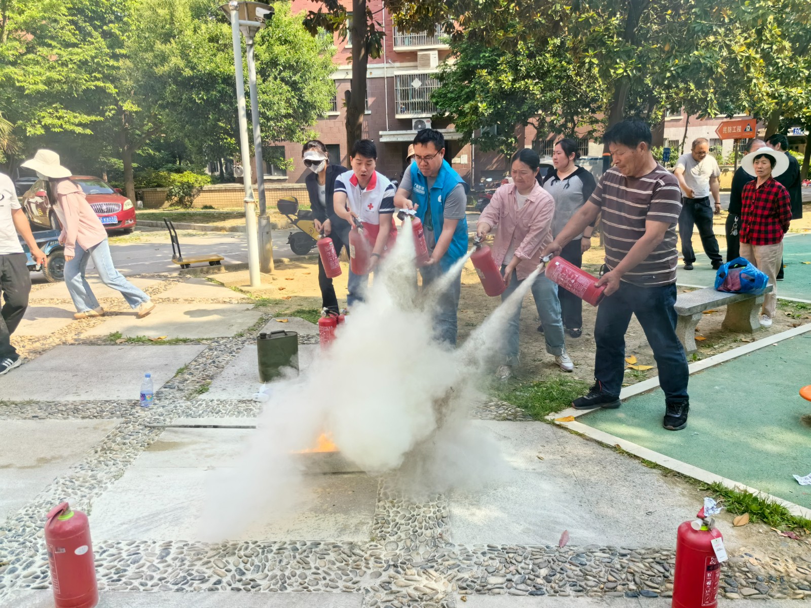 红十字志愿者首先向大家讲解消防灭火器的使用要点及方法,就灭火器使用四步法“一提、二拔、三瞄、四压”进行实际操练,“拔掉保险销子,喷头对准火的根部,按下开关!” 红十字志愿者一边演示一边讲解,在专业人员的指导下,大家纷纷拿起灭火器,尝试扑灭火源。除灭火器的使用要点外,红十字志愿者还耐心细致地讲解了火灾的危害和遇到火灾后正确的应对方法,以及除灭火器外其他的消防器材,如防烟面罩、消防铲等,并对消防演练操作不规范的地方进行指正,帮助大家熟练掌握灭火技巧,现场气氛热烈。