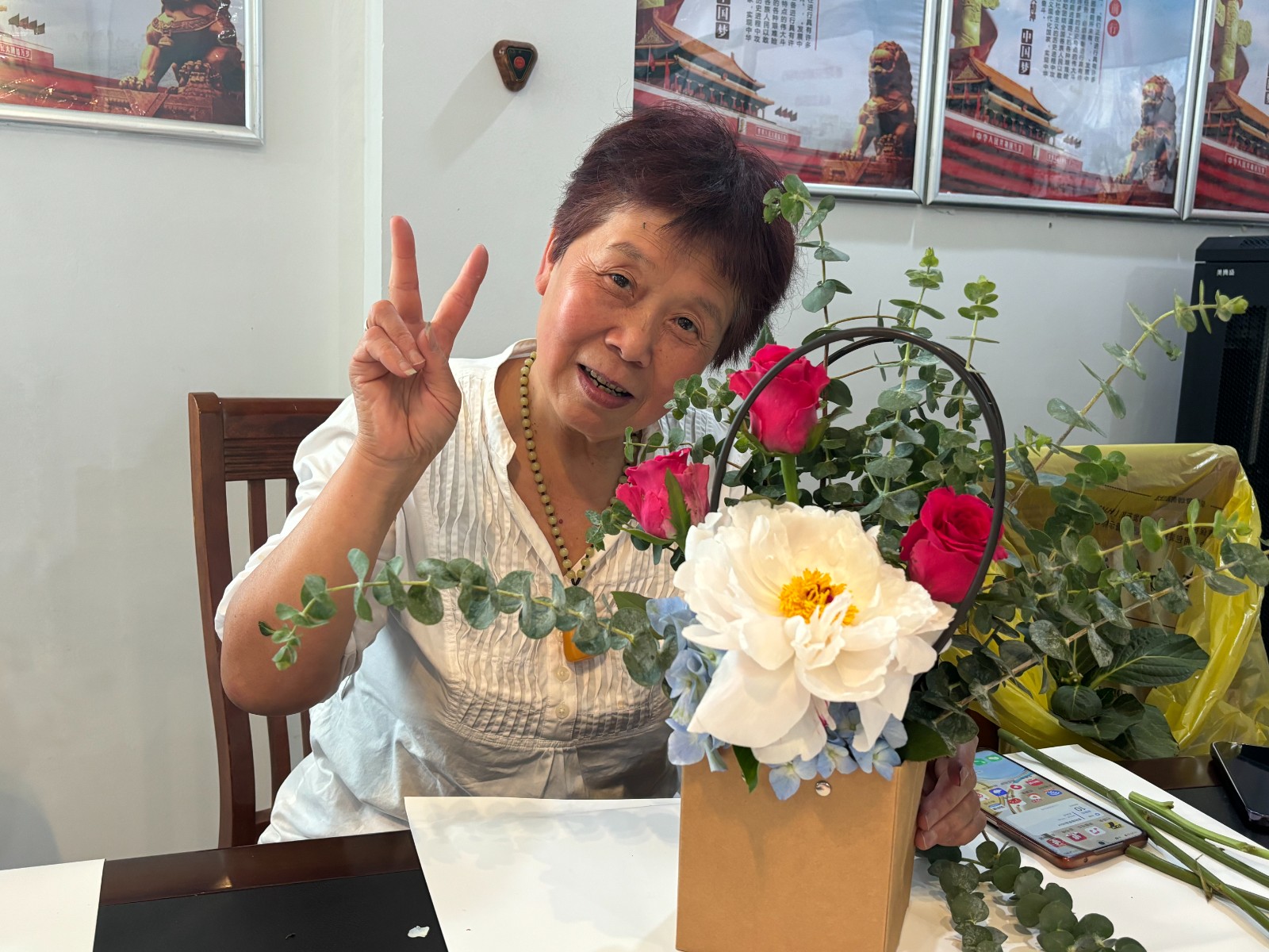 粉色的康乃馨、蓝色的绣球花、红色的玫瑰花⋯一朵朵鲜花在居民妈妈们的巧手下变得错落有致。在花香四溢和欢声笑语中,一件件绚丽缤纷、新奇新颖的插花作品完成了,大家手捧着自己的得意之作,反复观赏,脸上洋溢着成就感,纷纷相互拍照,留下自己的靓丽瞬间。