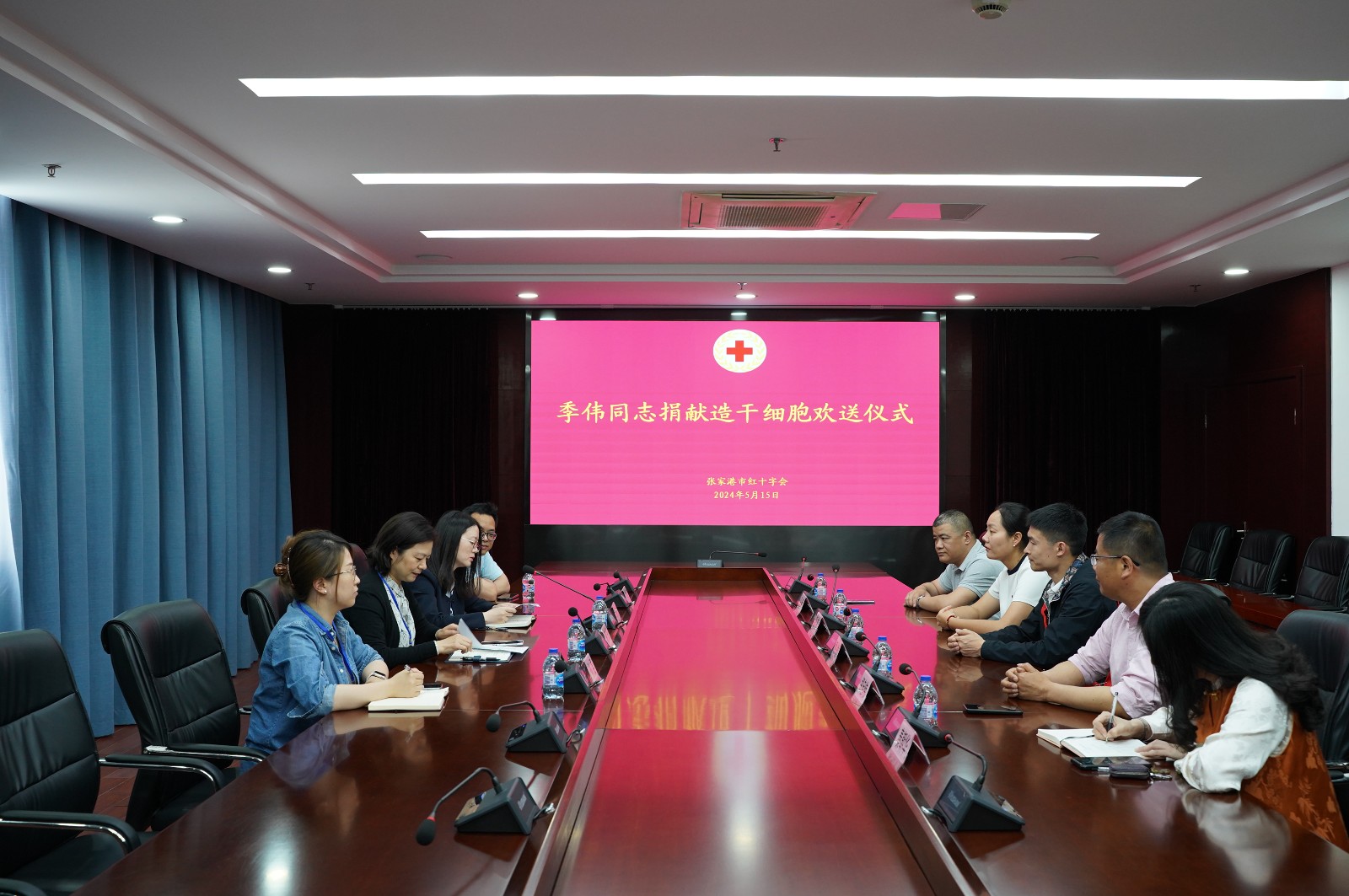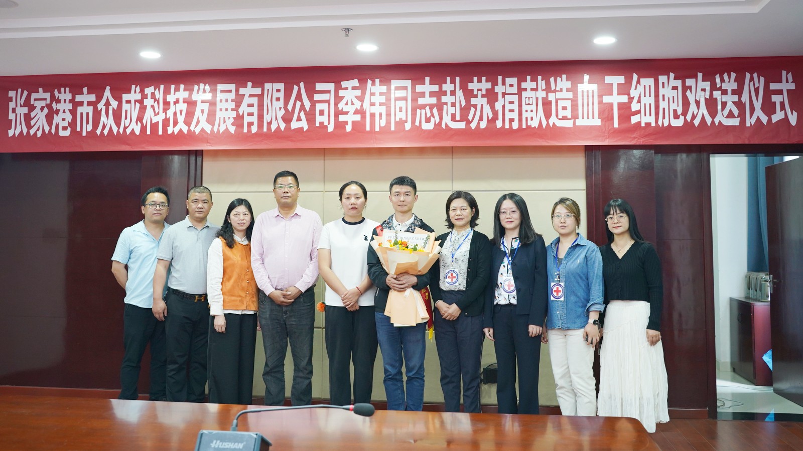5月15日下午,季伟同志赴苏州捐献造血干细胞欢送仪式在张家港市公共卫生中心举行。市红十字会常务副会长蔡贤,塘桥镇副镇长郑启伟、社会事业口卫健条线负责人秦朝华,张家港市众成科技发展有限公司总经理马辉,以及捐献者季伟及其家属参加。