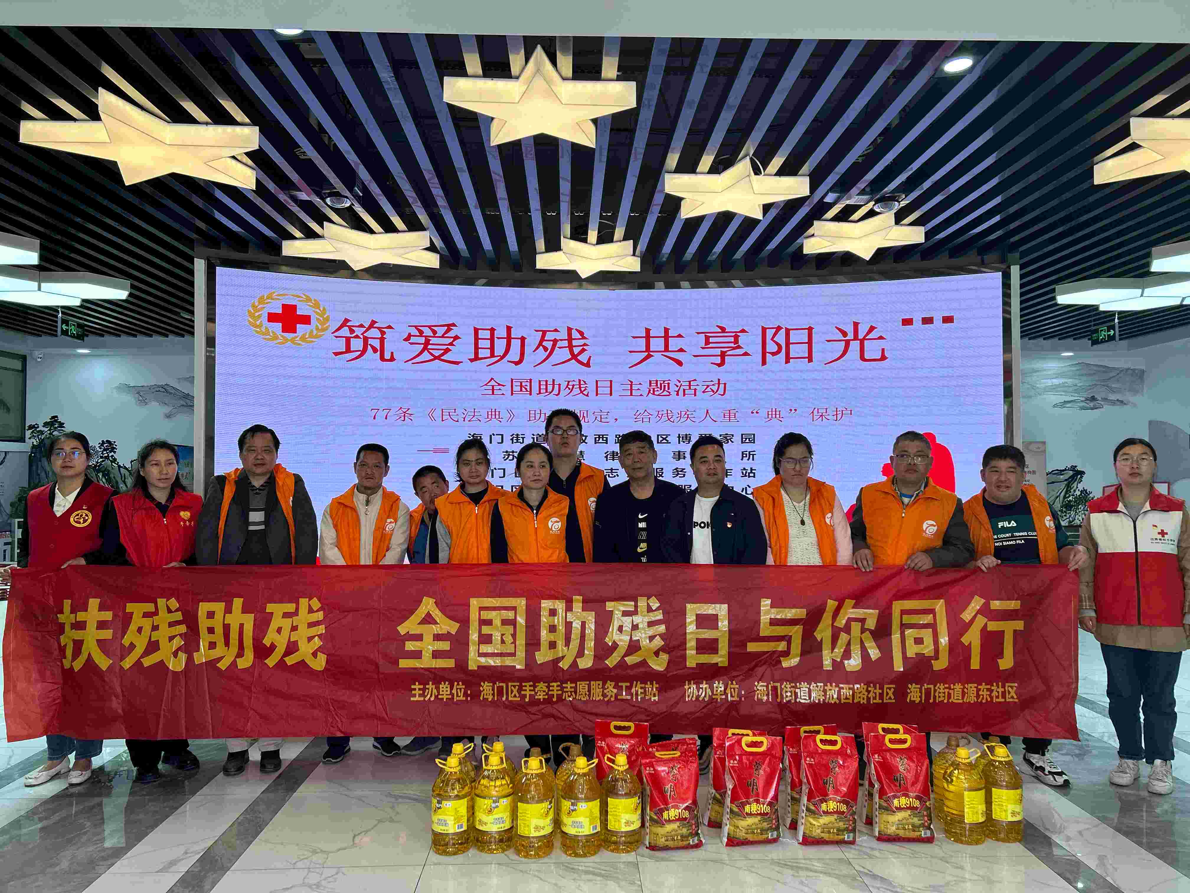 活动现场,解放西路社区红十字会博爱家园联合海门区手牵手志愿服务工作站为参加活动的残疾人准备了米和油等慰问品,传递社区大家庭的温暖与关爱。