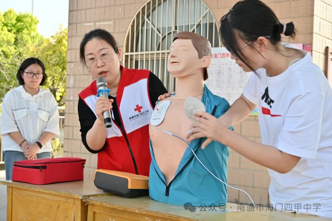 校医、红十字应急救护培训师朱晓明医师带领学校紧急救援社团学员向大家示范应急救护方法,现场教授应急救护一体机集合自动体外除颤仪(AED)的使用方法。