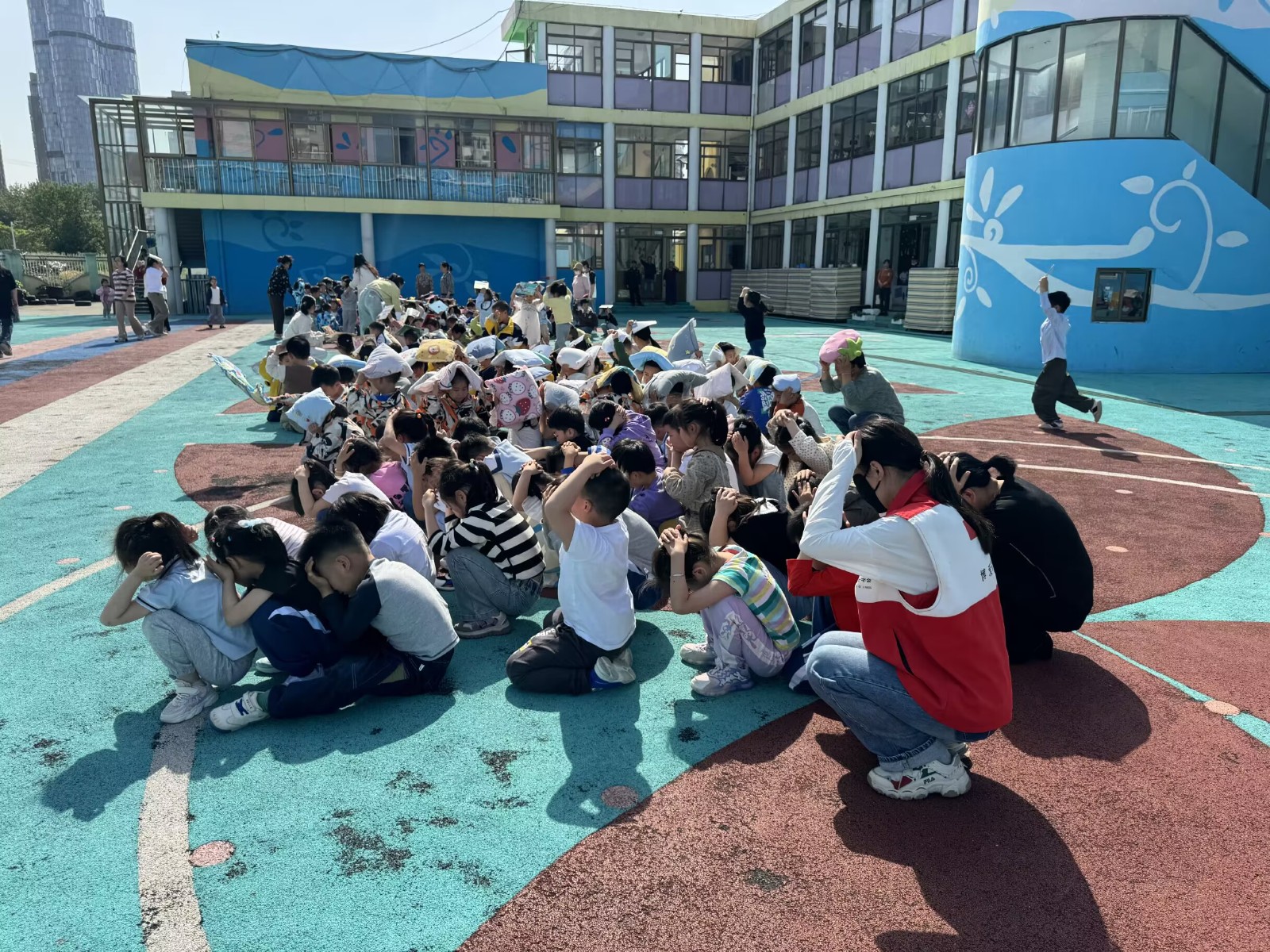 活动伊始,由安全员组织,同学们进行了应急逃生演练。在各班老师的带领下,小朋友们训练有素,在听到警报声后立即找好掩体躲藏,警报结束后,老师们组织大家弯腰护头,有序、安全地撤离到学校操场。整个演练过程紧张有序,有条不紊,疏散过程达到了预期的效果,也获得了蓝天救援队沈队的高度评价。