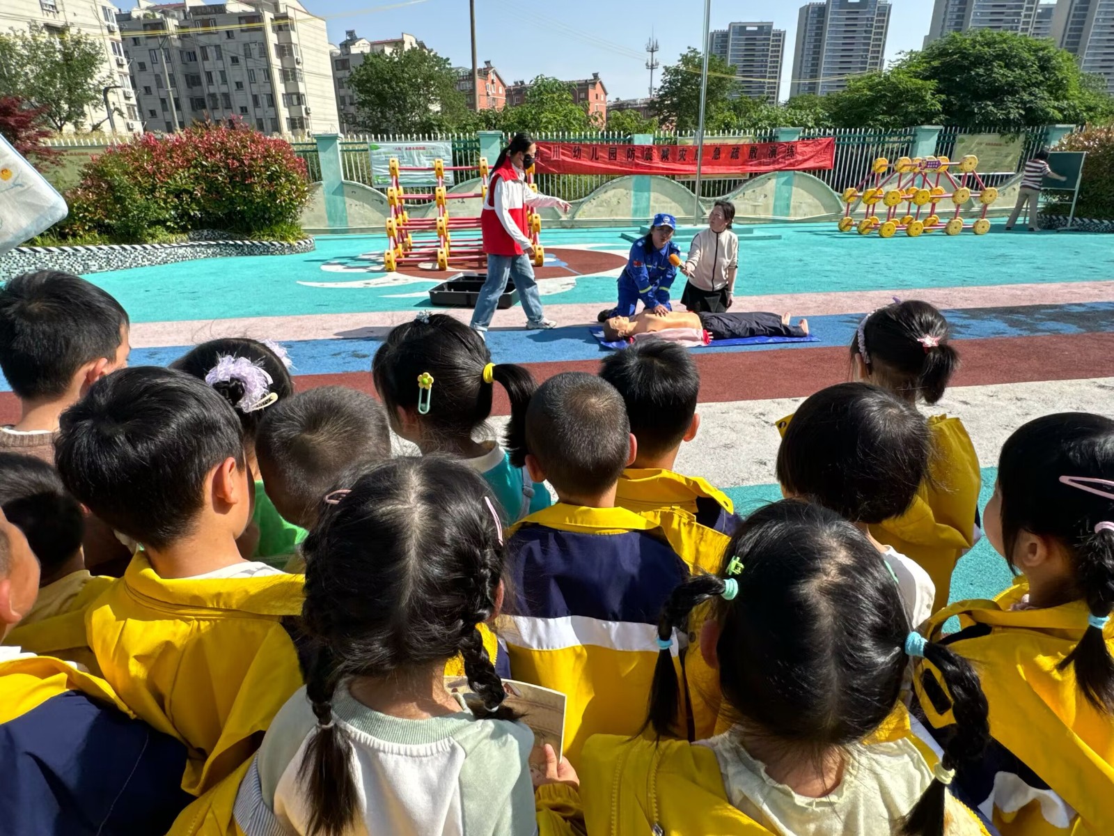 接着,沈队为大家详细讲解了在应急时刻如何做到相应的保护措施,同时教会大家如何正确地做心肺复苏、人工呼吸。教学完毕后,沈队邀请了教师代表上台演示,让小朋友们有了更加深刻地理解。