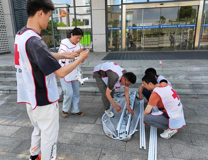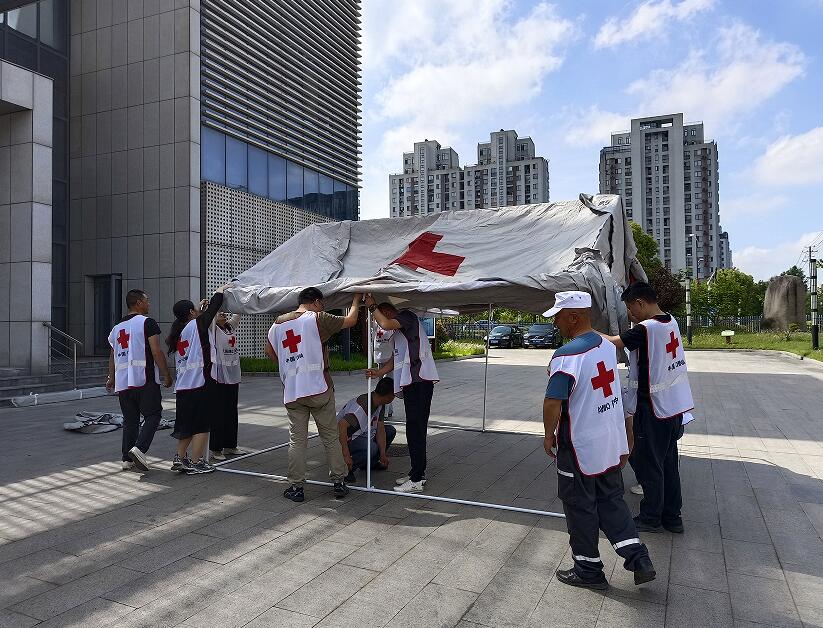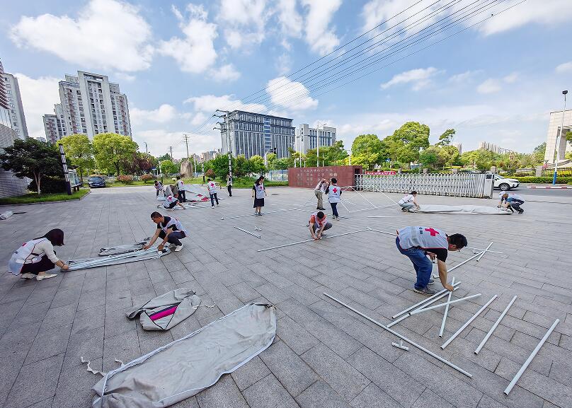 5月19日,如东县红十字赈济救援队组织开展12㎡救灾帐篷搭建训练。