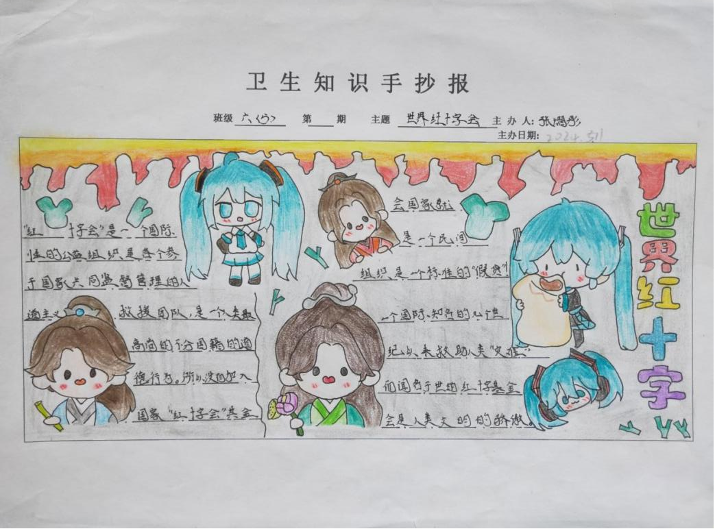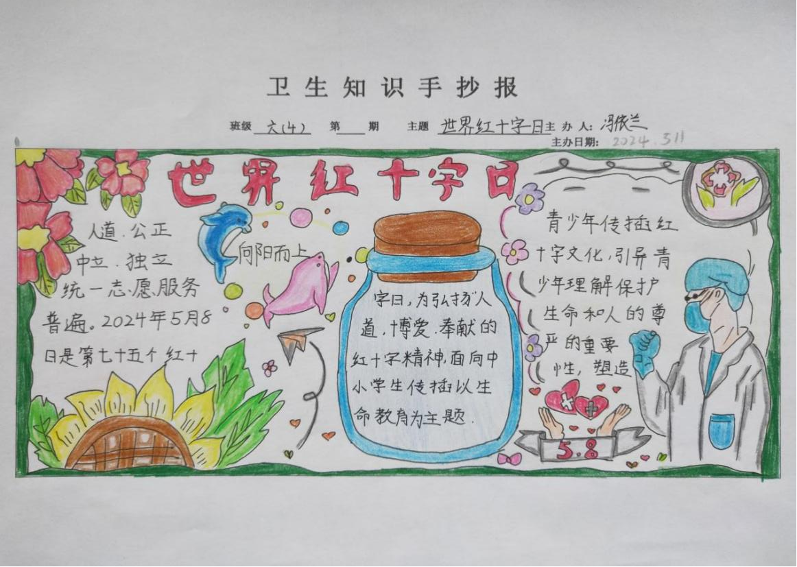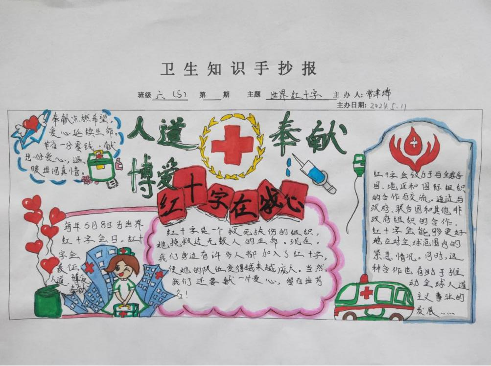 同学们用自己的智慧和巧手,制作出了一张张精美的手抄报。作品主题突出,版面设计新颖独特,图文并茂地介绍了红十字知识和红十字精神,把红十字会宗旨——保护人的生命和健康,发扬人道主义精神,促进和平进步事业,诠释得淋漓精致。