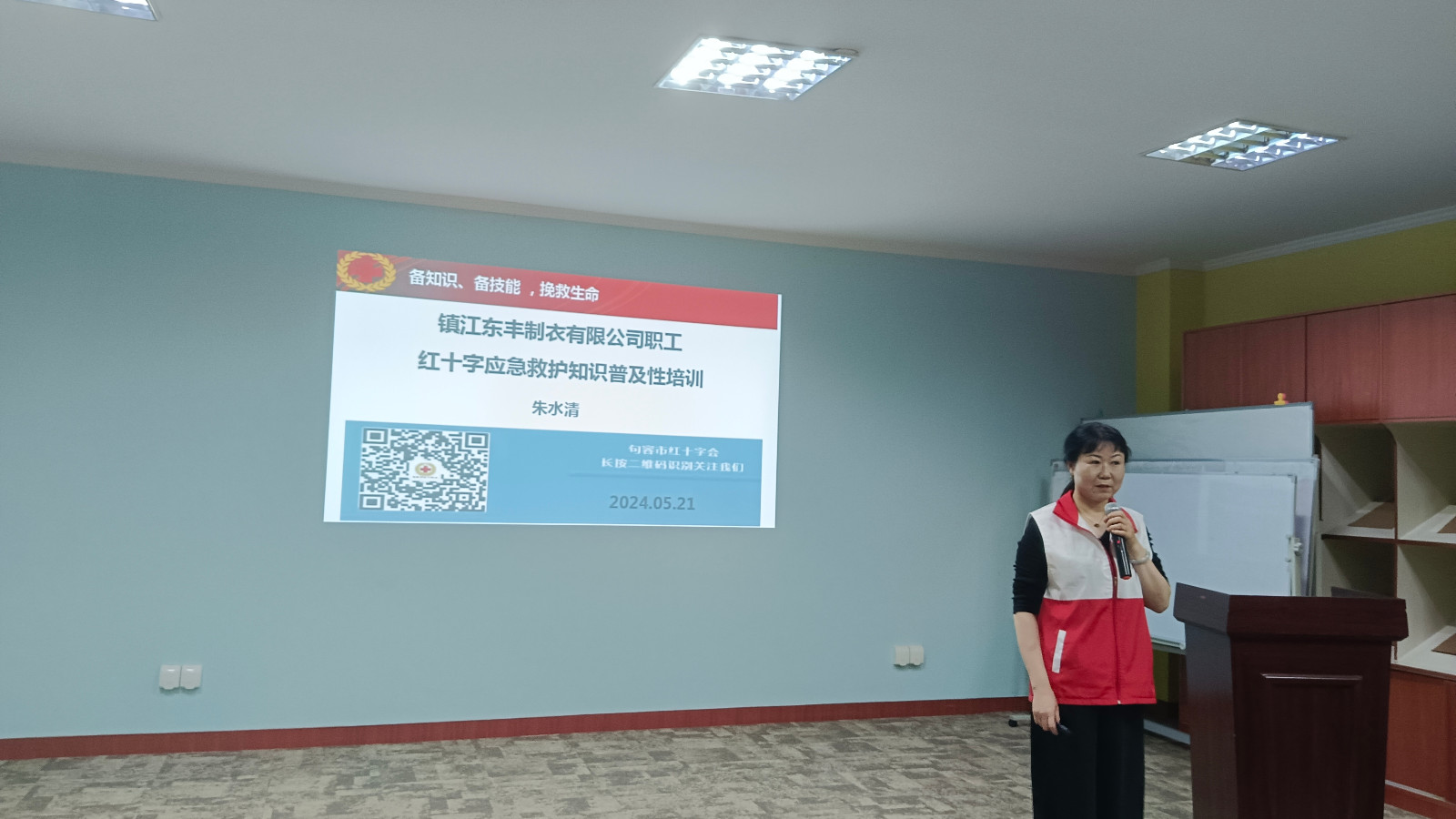 21日,句容市红十字会“救护培训进企业”走进镇江东风制衣有限公司,救护培训讲师朱水清为该公司30多名职工进行应急救护普及培训。