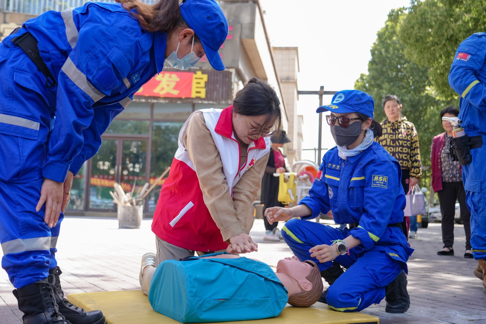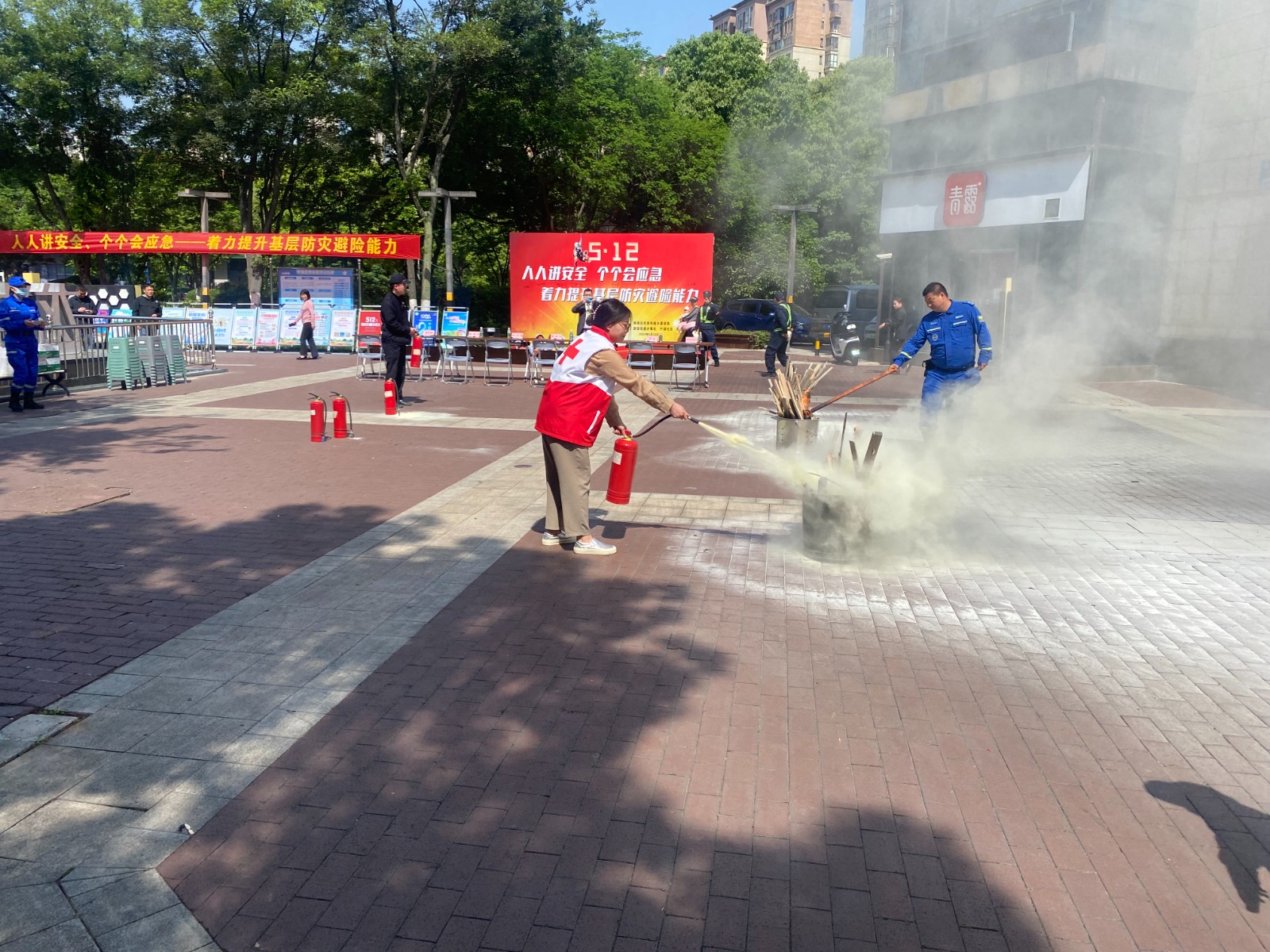 接下来,由救援队志愿者老师详细讲解消防安全和急救知识,现场普及了火灾的危害性、如何预防火灾以及火灾发生时如何应急处理的方法,并现场演示了灭火器的使用方法和逃生技巧。同时,红会志愿者们现场邀请社区居民、物业工作人员共同参与,进行灭火演练和心肺复苏演练。通过现场的生动讲解演示,让居民正确掌握灭火技巧、逃生技巧和急救方法,进一步提升防灾减灾应急自救意识。