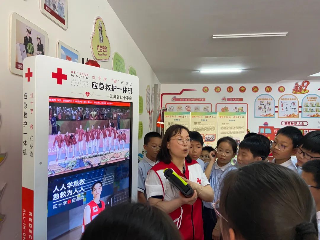 随后同学们来到学校的生命安全体验教室,范老师带领同学们进一步了解国际红十字的历史,讲解了自动救护一体机的使用方法,观看了生命安全学习课件,同学们积极参与,获益匪浅。