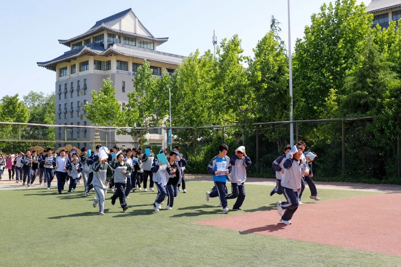9点10分,第一次“防震减灾”警报声响起,全体同学在班主任老师的组织下,迅速下蹲、躲避。9点12分,第二次警报声响起,学生在班主任的指挥下,按紧急疏散的程序和路线,快速、有序地撤离到运动场。班主任迅速清点人数,确认无伤无误之后,上报本班情况。全体师生在3分16秒内完成了应急演练,整个过程紧张有序、撤离迅速,有条不紊,无推拉、拥挤、冲撞现象发生,演练达到了预期的目的。