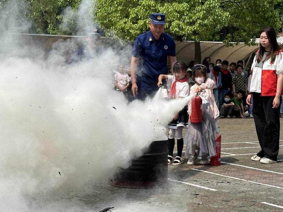 上午9:20,演练正式开始。随着演习警报声响起,点燃烟雾弹,学校各楼层负责老师迅速引导学生安全、快速撤离,就近到达操场。消防员们对灭火器正确放置和使用进行了详细地讲解和演示,在现场指挥和消防员的指导下,学生有序开展灭火器使用演练,在实践中巩固技能,熟练掌握了灭火器具使用方法。让学生们对灭火器的使用有了更直观的认识,提高了他们在火灾中自救互救的能力。