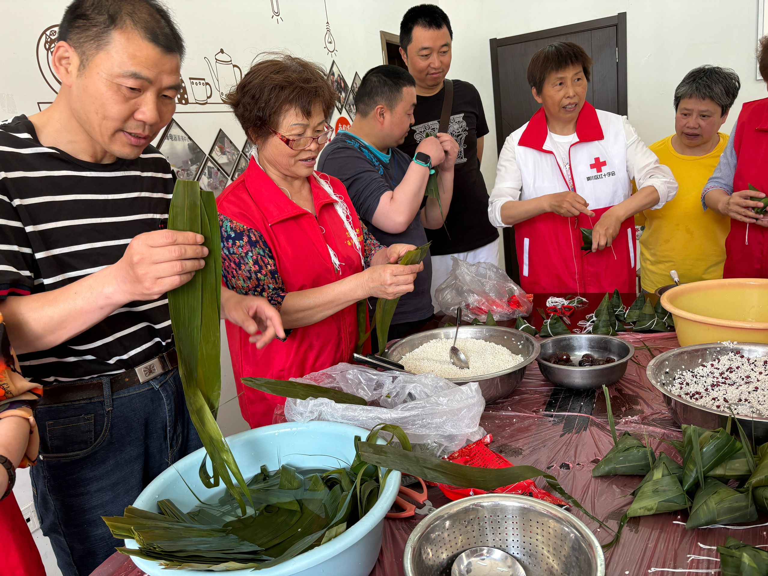 活动开始前,红十字志愿者们便已经忙碌起来,他们将新鲜的粽叶、糯米、红枣、豆沙等用清水多次淘洗干净并整齐地摆放在桌面上,为接下来的包粽子活动做好准备。随着活动的正式开始,大家纷纷动起手来,将粽叶折叠成锥形,再填入糯米和红枣,最后用细绳捆绑结实。虽然每个人的手法不尽相同,但大家都沉浸在包粽子的乐趣中,不时传来阵阵欢声笑语。