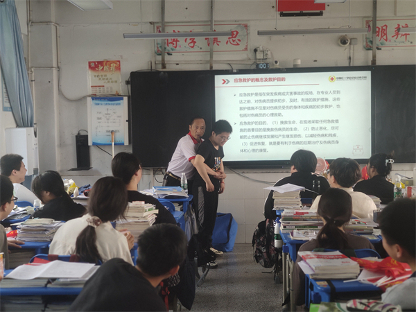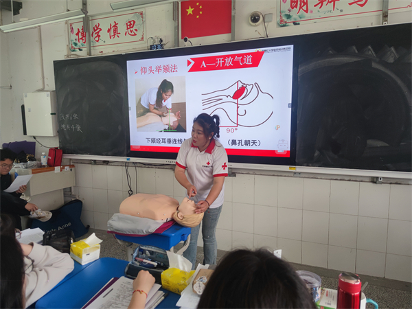 红十字会培训师们为师生们讲解了应急救护“黄金四分钟”,从呼吸心跳骤停的常见原因、心肺复苏的具体步骤和相关注意事项等方面做了指导教学,并对意外突发情况处理方法、止血包扎、溺水救护、骨折固定等知识进行详细讲解。