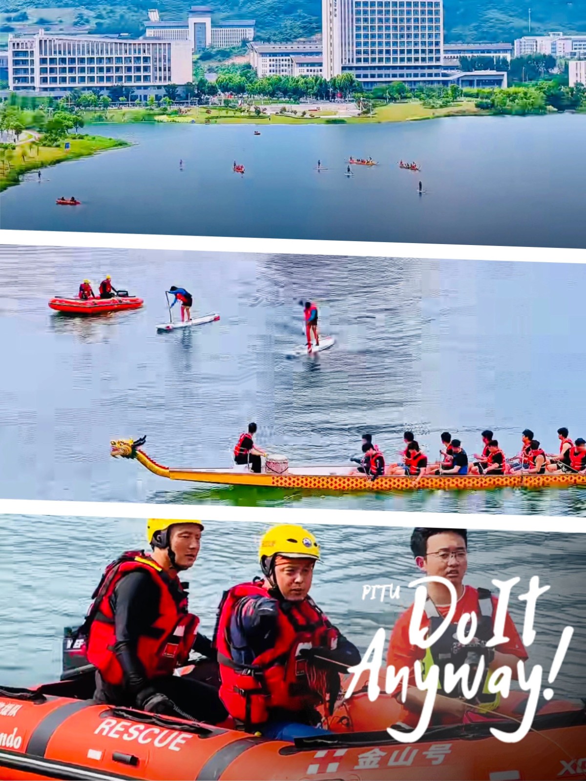 争渡,争渡,7日下午十里长山南麓大学城,江苏科技大学长山校区海韵湖鼓声阵阵,江科大第二届校园龙舟师生联赛正在进行,这时的“铁锤哥”酒窝收敛,多了一份严肃,身着水域救援PFD装备,左手握着操纵杆定舟救援艇西津渡号,与队友朱俊驻守起点。湖面上,与脱弦之箭的龙舟形成对比,队长吴锦平与队友张勇进驾驶着救援艇金山号徐徐跟进。张勇进已经是第二年参加龙舟赛保障,多年前曾作为划手参加市里的龙舟赛,鼓声是号色,律动着血脉,但如今的角色岗位有别,高跪姿操艇,小着油门尽量少地起浪避免影响选手,但当有事,则动如蛟龙。