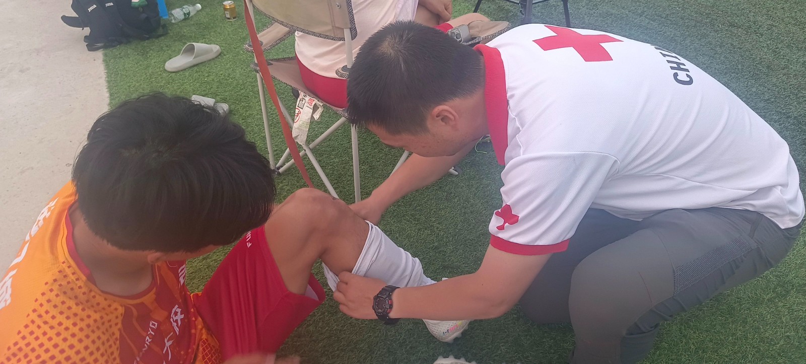 8日,队员万伟等接棒继续值守高考护航。当有朋友特意前来打招呼,说是从微信群里看到送考家长们发的照片中见到英姿飒爽着护航,心里一暖,一份激励在流淌。9日晚,万伟又出现在长江畔镇江市西口门足球基地球赛保障现场,每逢周日,镇江市成人业余足球联赛在这里进行,和队友吴东、陈森、李银芳及倪斌分别承担着上、下午场及晚场球赛的应急医疗救护保障任务。今年4月万伟受救援中心推荐至南京参加江苏省红十字会专项培训,成为一名中国红十字救护师资。学有所用,球场边万伟和吴东一起为一名踝关节扭伤的球员运动冷却喷雾处置后进行了绷带8字包扎,同时将注意事项告知。