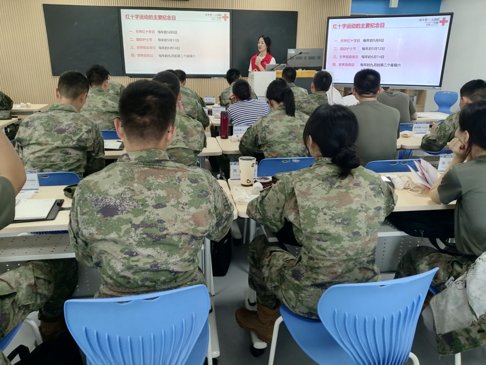 6月12日,秦淮区红十字会为南京某部队院校官兵们开展了一场内容丰富、实用性强的救护培训课。此次培训的内容主要有自动体外除颤仪的使用、纱布包扎技巧以及心肺复苏的理论与实践展开,84名官兵报名参训。