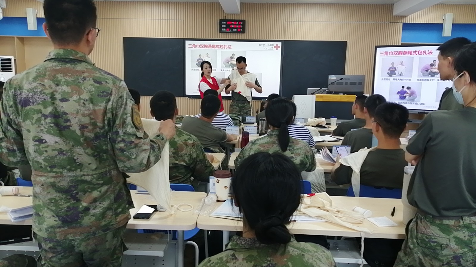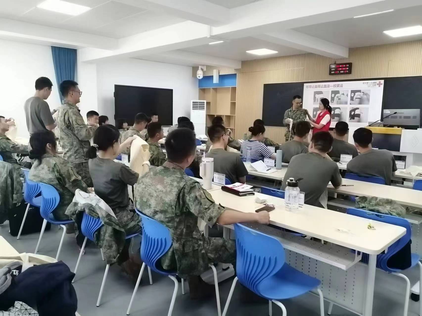 教室内,老师详细介绍了“心肺复苏”动作要领、“自动体外除颤仪的使用等应急救护理论常识。在纱布包扎的教学环节中,杨静老师向官兵们展示了不同类型伤口的正确处理方法。官兵们在杨老师的指导下,逐一练习环形、螺旋、八字等包扎方法,确保在面对实际伤口时能够迅速而准确地进行处理。
