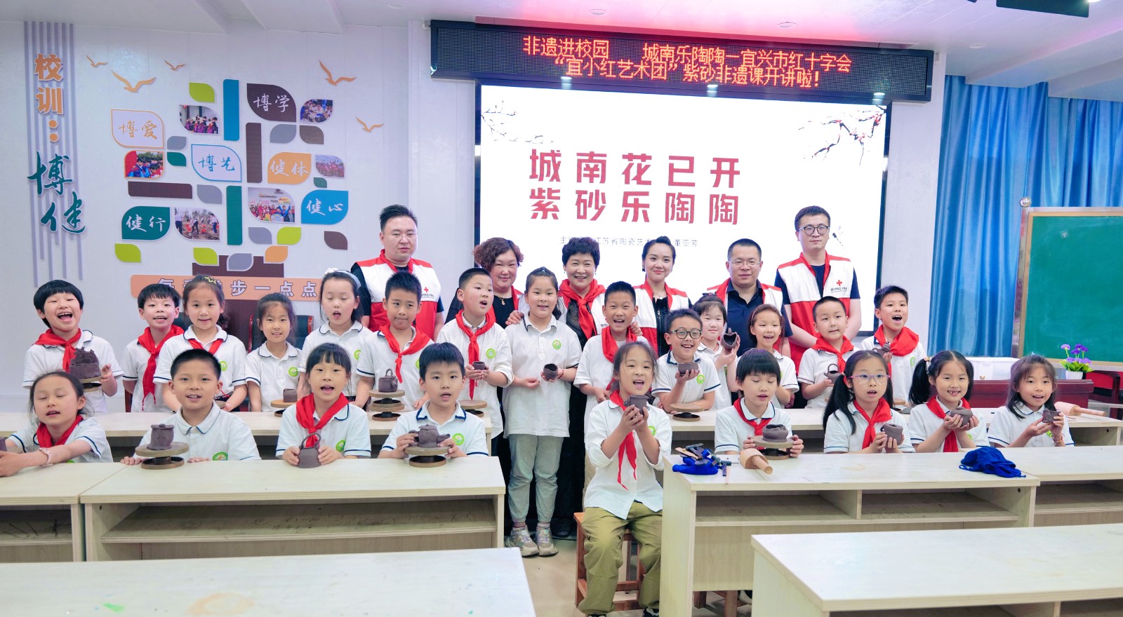 非遗进校园,城南乐淘淘。6月4日,宜小红艺术团走进宜兴市城南实验小学,为陶艺社团的孩子们上了一堂生动的紫砂制作体验课。