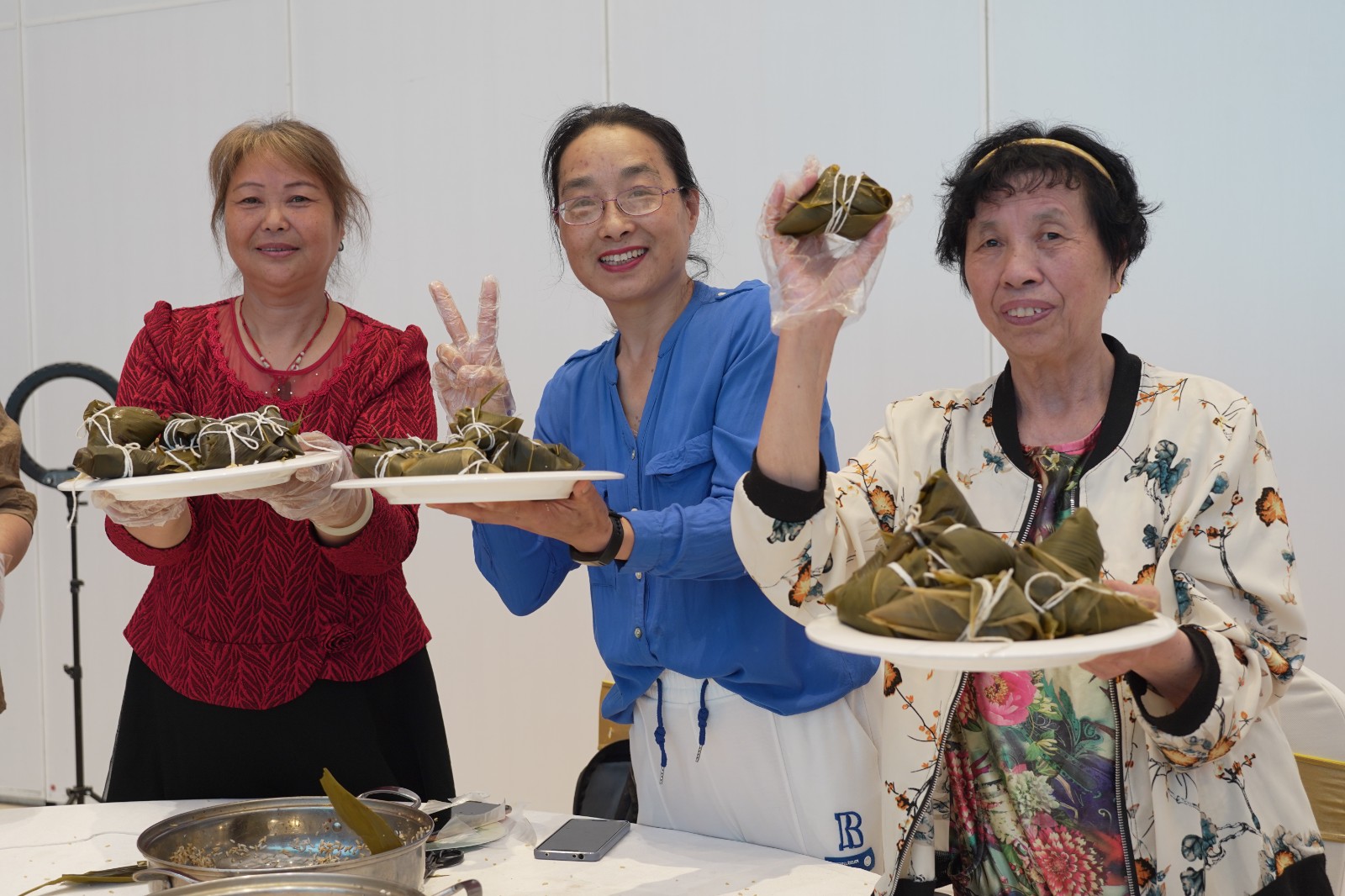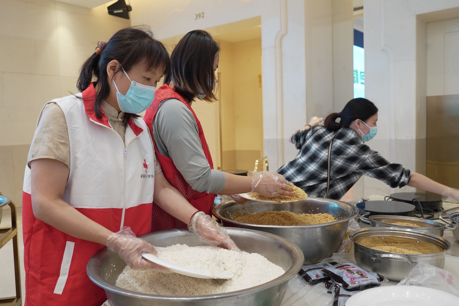 活动现场,红十字会志愿者准备好包粽子所需的所有食材,与大家一起清洗粽叶、淘洗糯米、腌制肉馅。大家熟练地折粽叶、填糯米、放馅料、压紧实、缠棉绳,整套动作一气呵成。转眼间,一只只棱角分明“超有料”的手工粽子便包好了。在包粽子的过程中,大家一起聊聊家常,唱着小曲,整个活动在大家欢声笑语中度过。