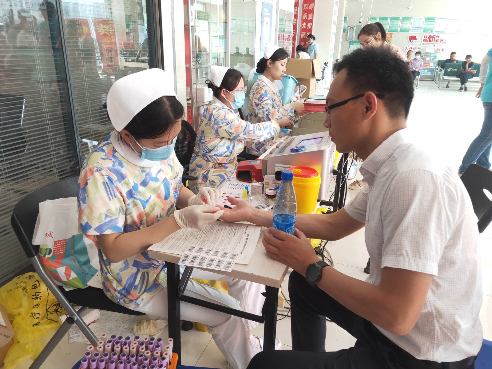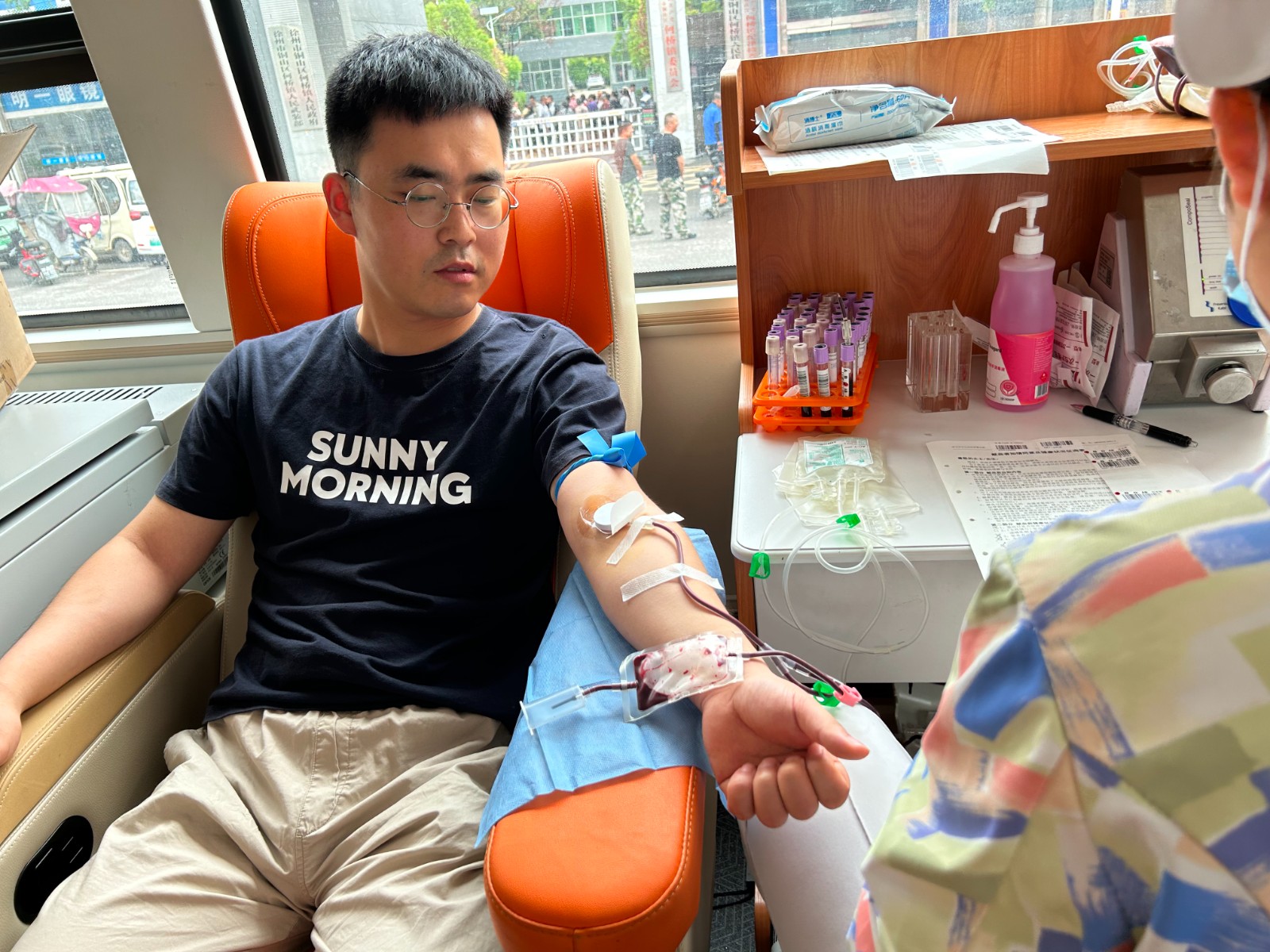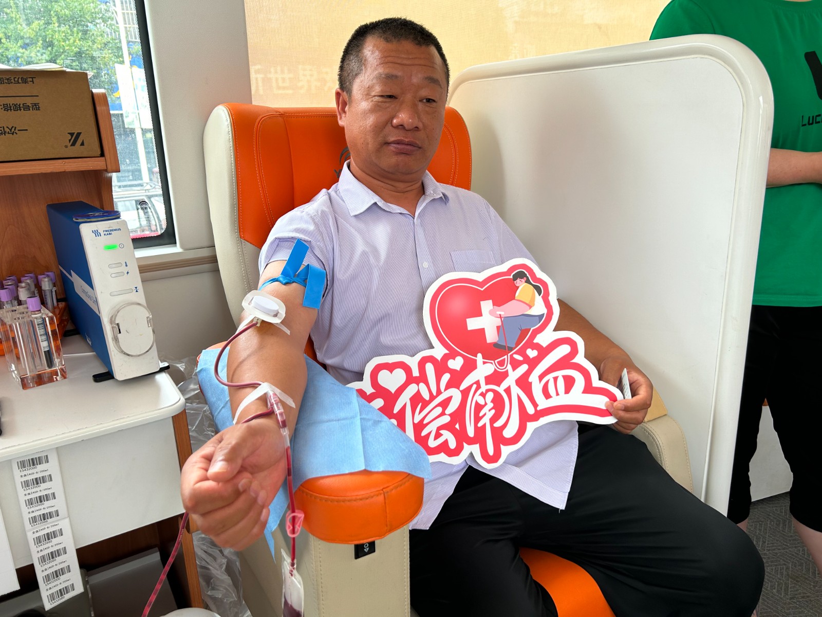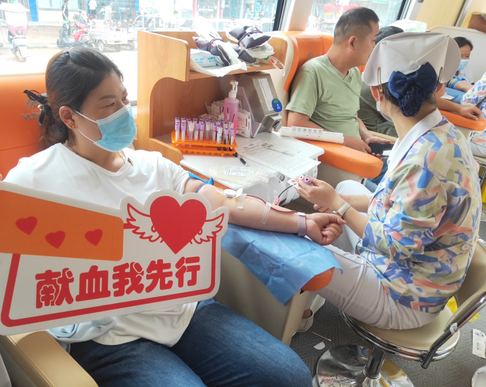 老师们有序地填写登记表,测量血压,采样验血合格后,纷纷撸起袖子开始献血。涓涓热血流入储血袋内,温暖在传递,生命的希望也在延续。