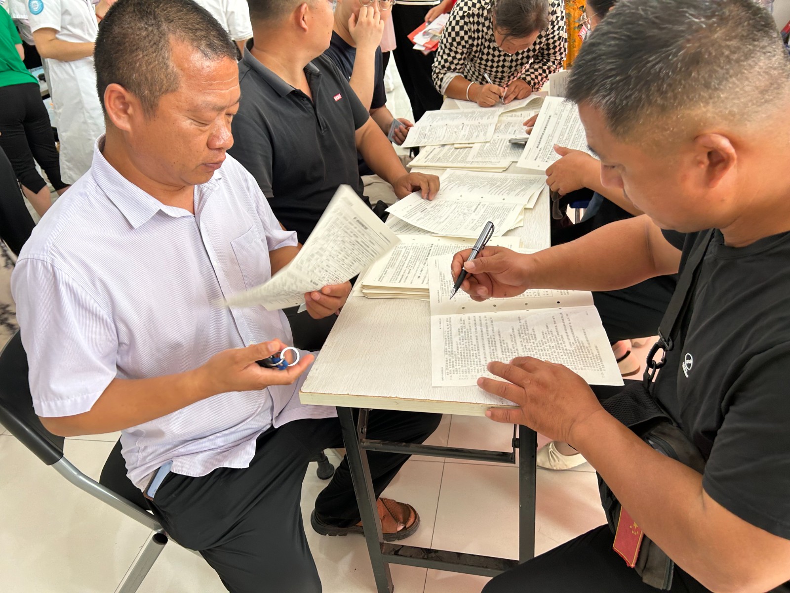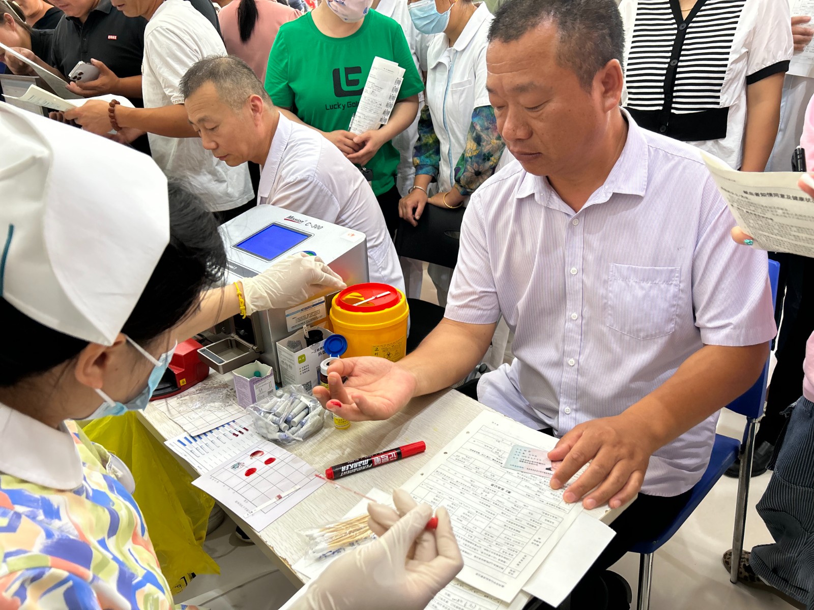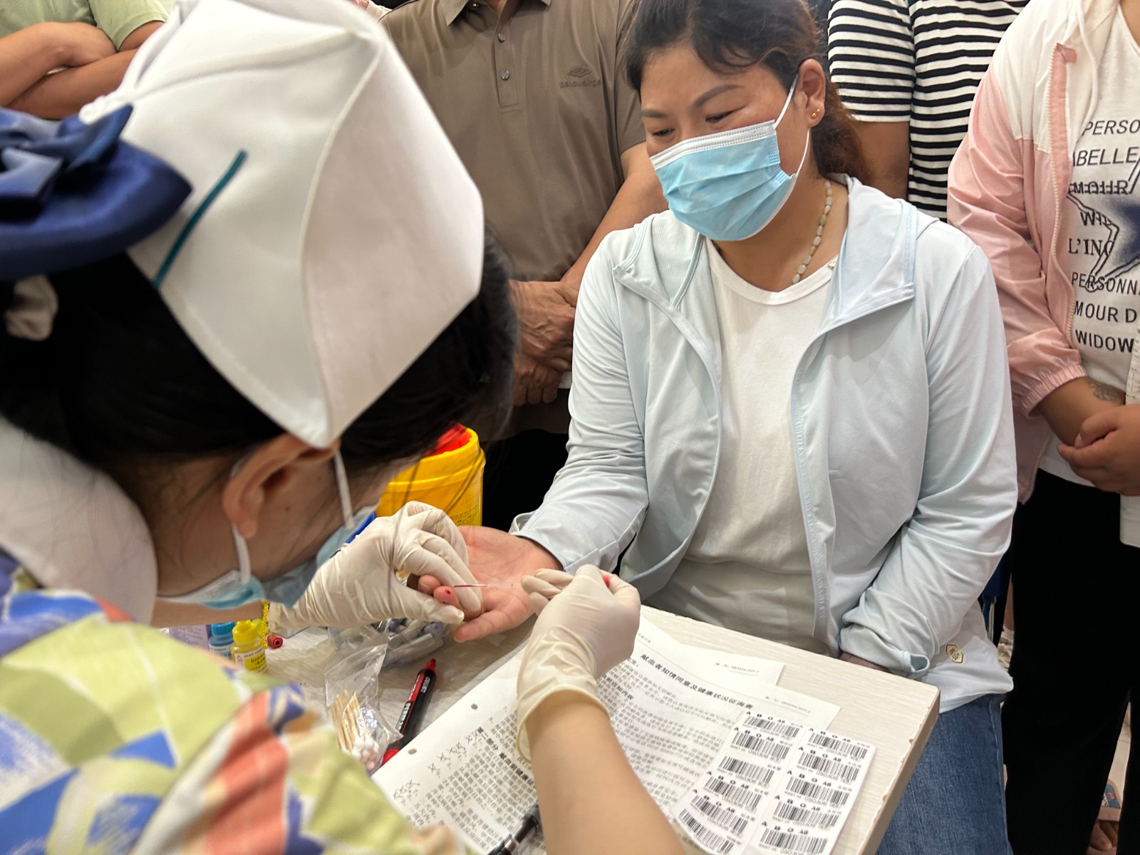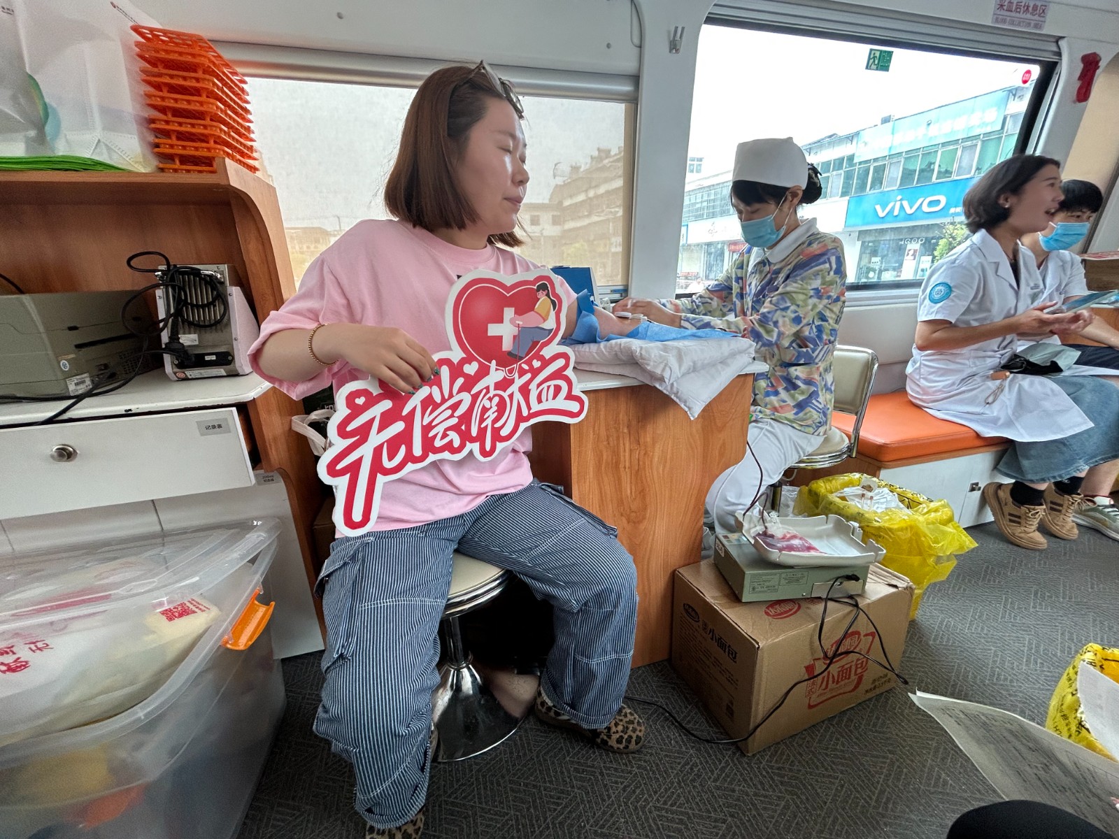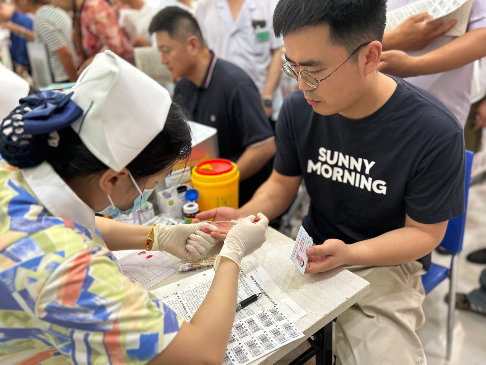 老师们有序地填写登记表,测量血压,采样验血合格后,纷纷撸起袖子开始献血。涓涓热血流入储血袋内,温暖在传递,生命的希望也在延续。