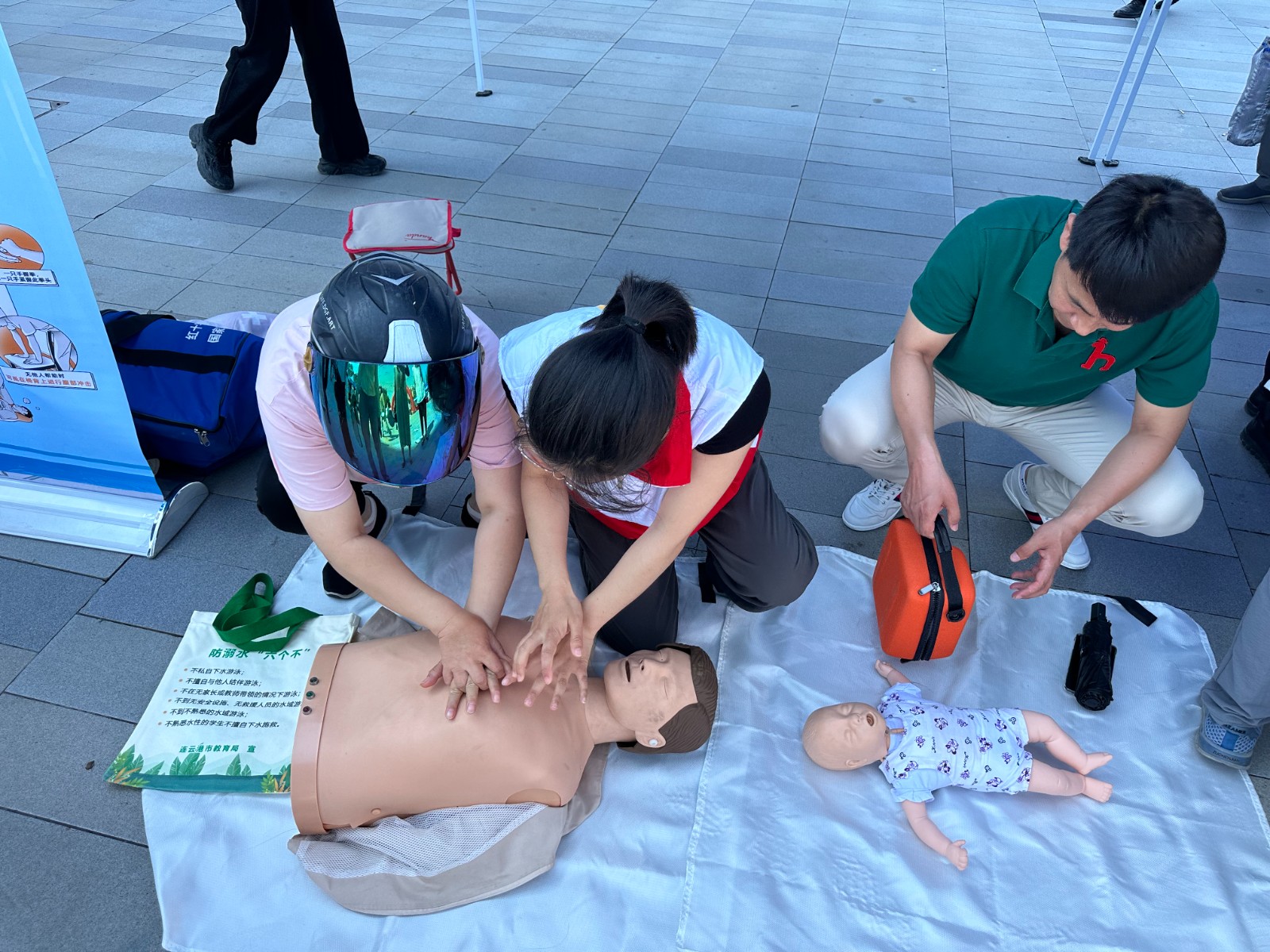 活动现场,红十字会发放宣传册并邀请师资来到现场开展救护培训。培训以理论讲授、实操演示相结合的方式开展,主要围绕心肺复苏、AED使用、气道异物梗阻、溺水等常见突发意外事件现场处理的急救常识开展。借助模拟人实际操作演示心肺复苏、AED的使用、气道异物梗阻等急救技能,强调了“黄金四分钟”的重要性,传递了“先救命,后治伤”的现场应急救护理念。