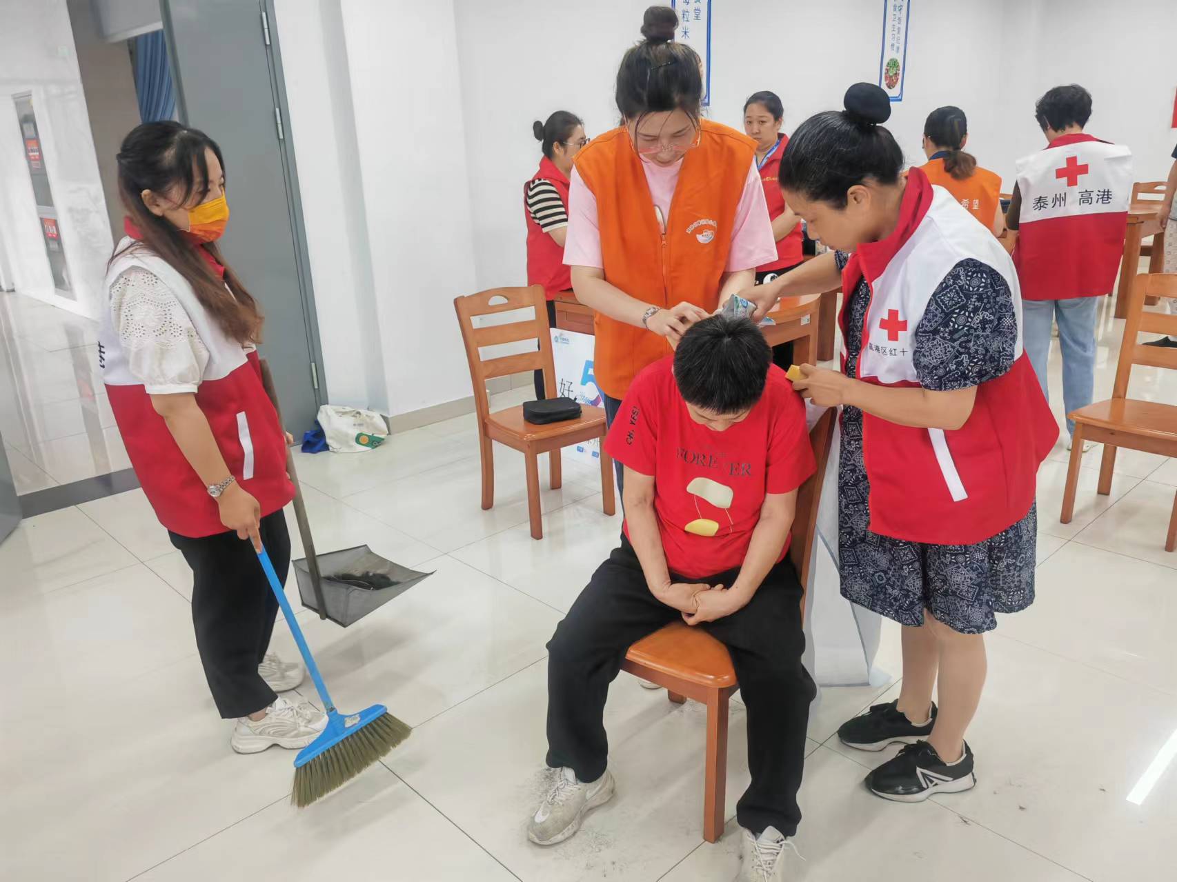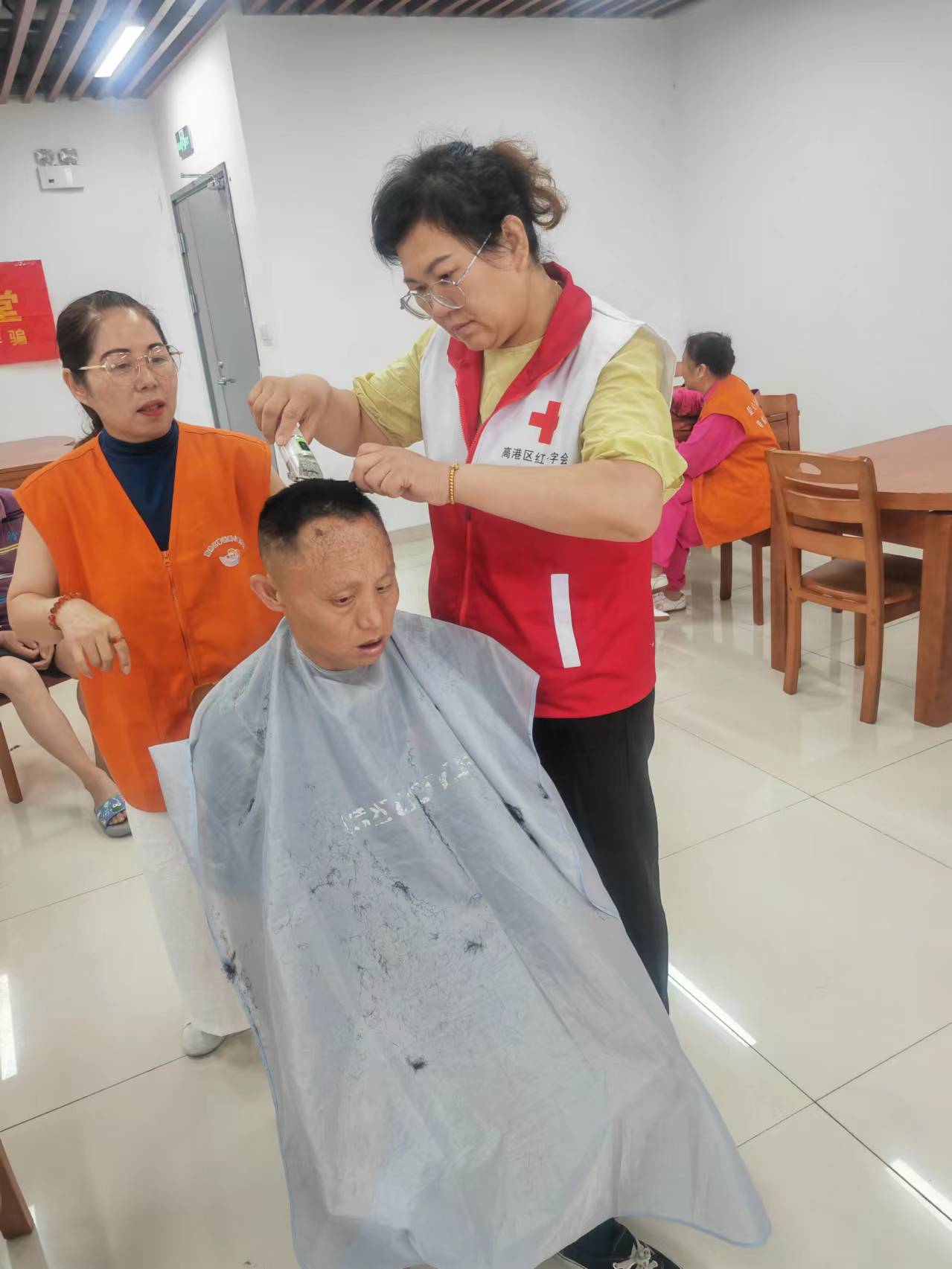 6月20日,高港区红十字志愿者到区老年人康复中心开展助残活动。10多名红十字志愿者准时在区老年人康复中心集合,他们自带围裙、推剪等工具,为20多名残疾人义务理发。康复中心的残疾人对这些穿着红十字马甲的志愿者都非常熟悉,自发的排好队伍,有序落座,静静的享受理发带来的快乐。康复中心的负责人表示:这些残疾人好久没有理发了,也没有理发师愿意上门服务,红十字志愿者的服务解了燃眉之急!志愿者在理完发后,自发给康复中心打扫卫生,并承诺,只要康复中心有需要,就是红十字志愿者的责任,一定会定期上门开展服务,用实际行动关爱残疾人群体,传递好红十字的爱和温暖!