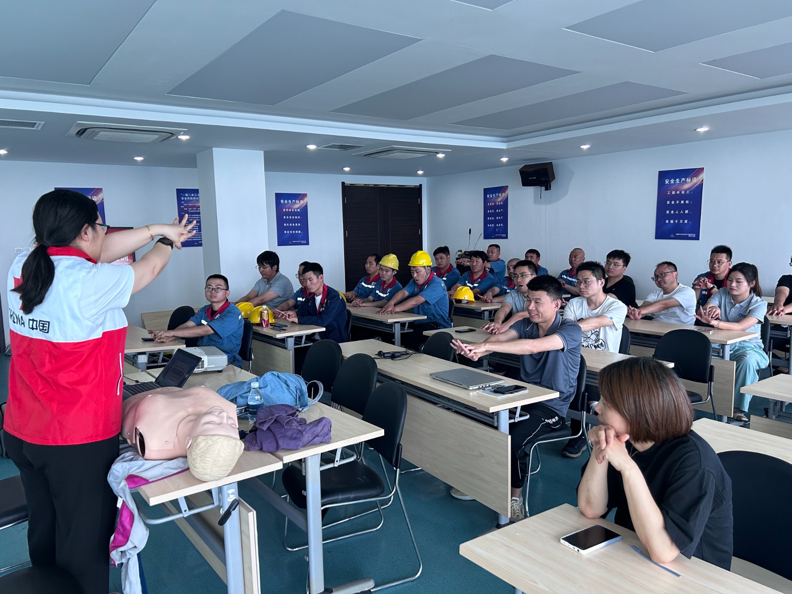 活动邀请了崇川区红十字会讲师团马培老师为大家现场授课。马老师现场用人体模型指导大家模拟训练胸外按压、人工呼吸等急救技术的操作,讲解了心肺复苏操作流程。另外还就企业员工的作业性质讲解了烫伤、止血、外伤骨折简单包扎等常见急症及意外伤害的应急救护,并组织在场学员分组进行实操训练。参训学员们专心听讲,虚心请教,踊跃参与实操练习,还与马老师交流了急救时如何调整心理状态,使现场活动氛围变得更加浓厚,课堂气氛活跃。