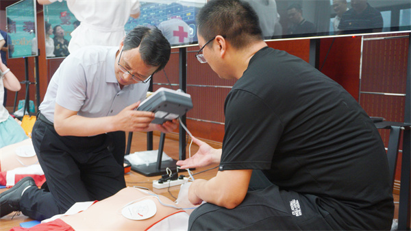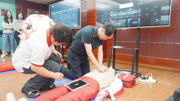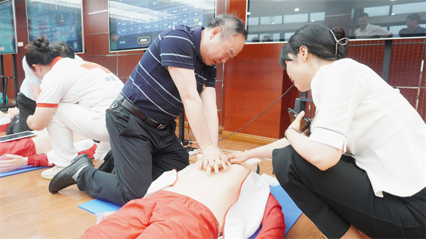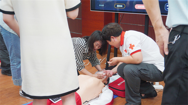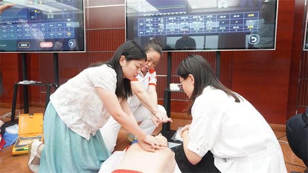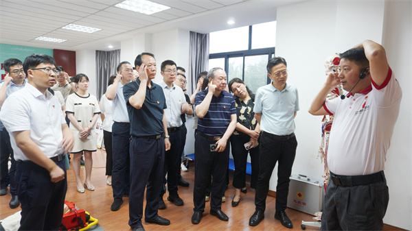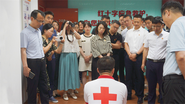 蒋部长一行参观了市红十字应急救援队物资装备库、养老照护培训教室、应急救护培训基地等,听取了市红十字会工作情况介绍,对市红十字会常态化开展防灾避险和应急救护培训工作给予了充分肯定。随后参加了救护培训,学习了防灾避险和应急救护知识,了解了心肺复苏、海姆立克急救法、AED使用等技能,并在老师的指导下进行了实践操作。他们在课堂上认真学习理论知识,跟着老师练习急救技能;在实践操作中,大家将上课时学到的知识点进行反复操作训练,直到熟练运用为止,当看到学员们完美的操作表现,大家都不约而同地响起掌声。