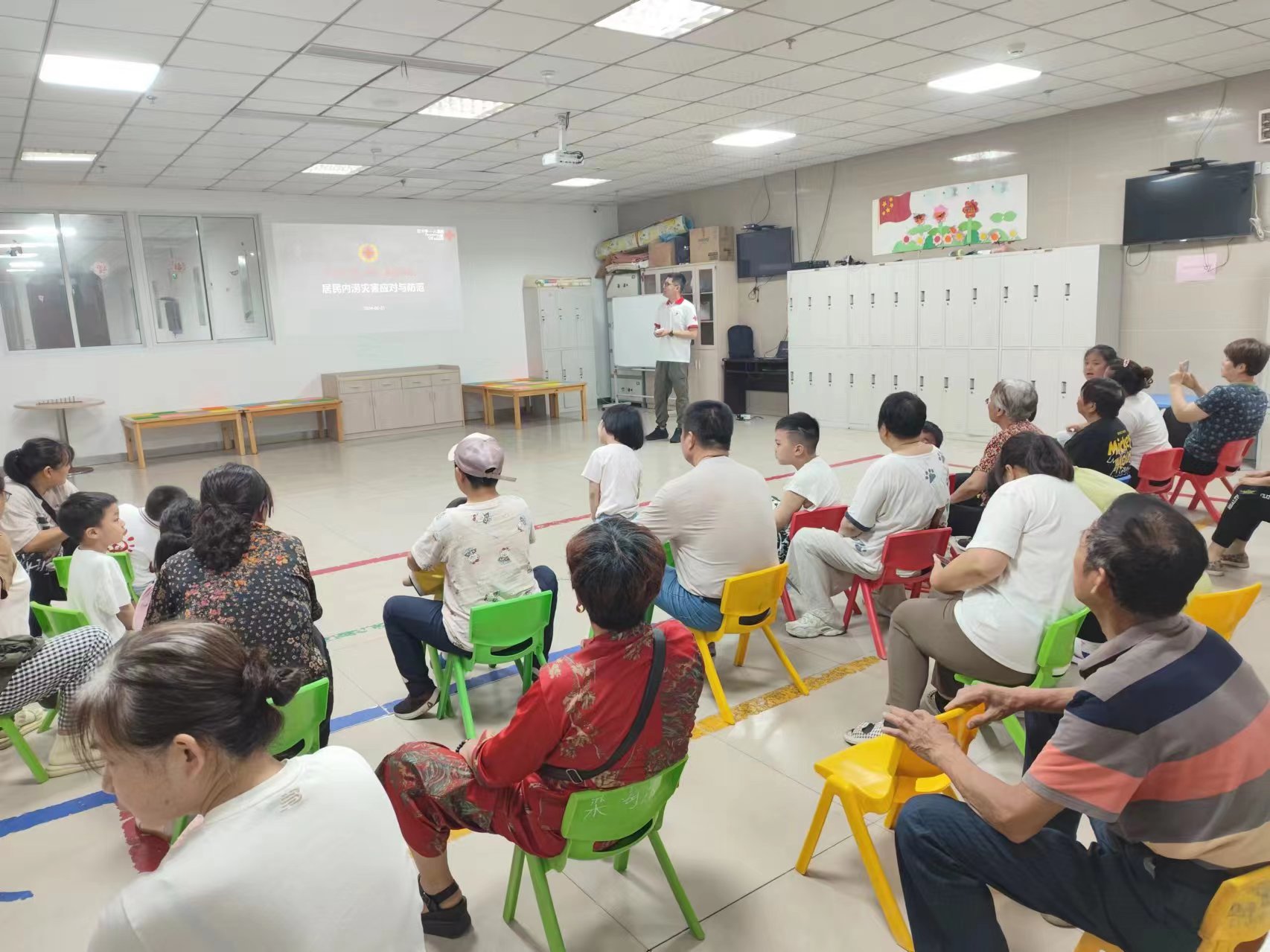 培训会上,区红十字会应急救援队师资曹跃跃为康复机构的老师、学生家长做了防溺水专题讲座及对内涝灾害的防范准备、内涝灾害的应对措施、暴雨天气户外行走安全准则、暴雨天气应急避险策略等方面进行了详细讲解。