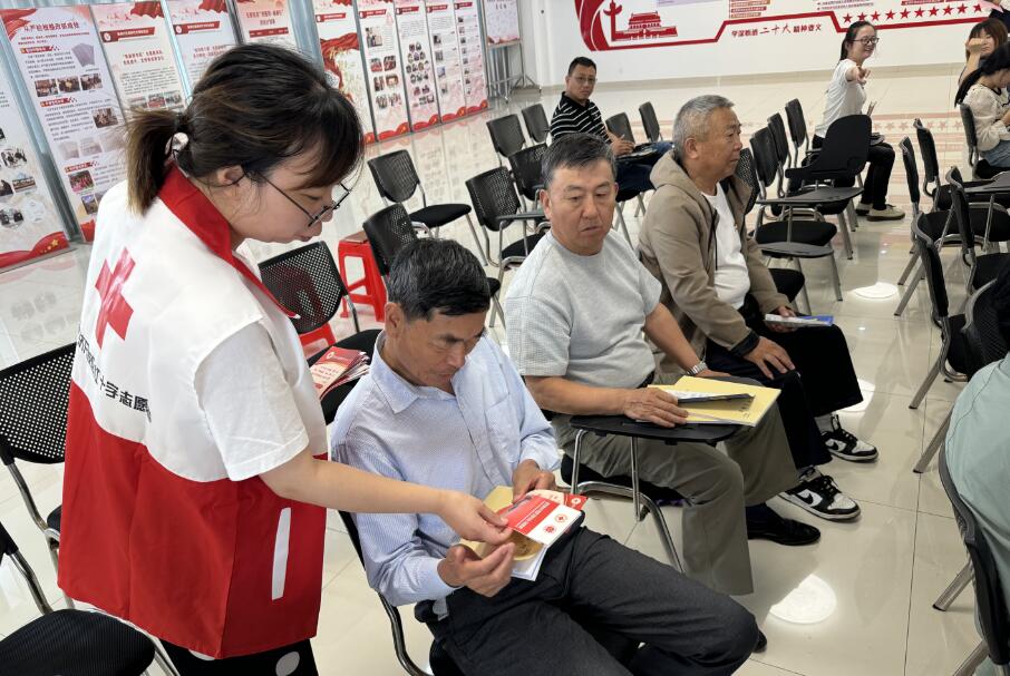 6月27日上午,经开区振新社区红十字会志愿者给社区党员们发放红十字会宣传资料