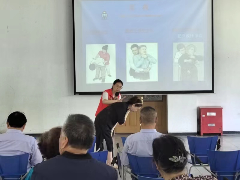 “心脏骤停,抢救的最佳时间在四分钟之内,否则大脑会产生不可逆的损伤,我们要立即拨打120最大程度上挽回生命”培训现场,高老师通过生动形象的示范和简洁易懂的图片让大家领悟现场急救、心肺复苏等基本救护技能要领。在教学过程中,高老师邀请现场居民一起参与其中,手把手教导居民在危险时如何急救和自救。“当发现有异物堵塞气道时,应第一时间采取海姆立克急救法,我教大家一个‘剪刀石头布’的口诀……”高老师详细地向居民讲解各环节的姿势和手法,确保动作标准、力度到位、节奏准确。