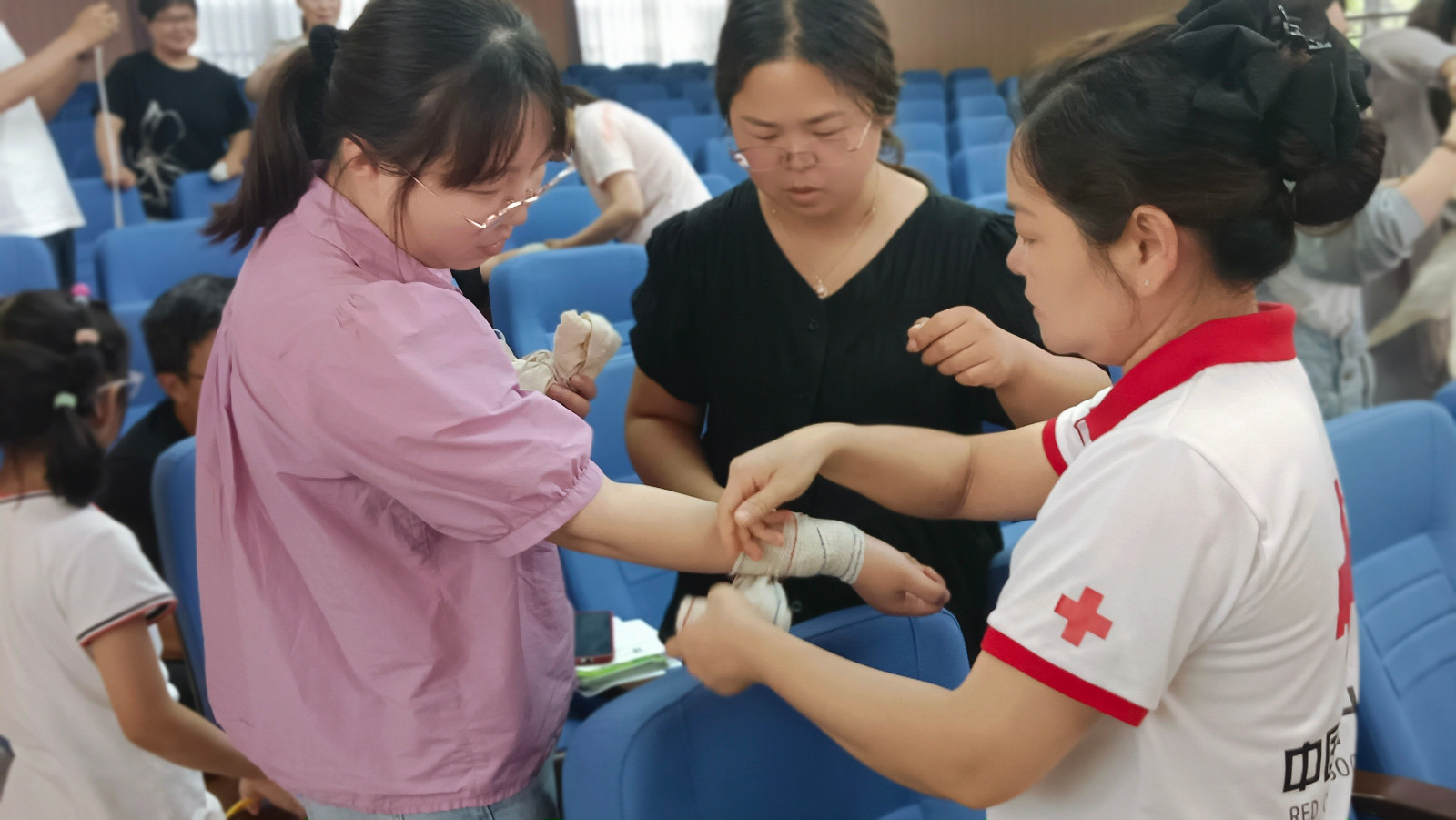 培训中,赵小文还向大家教学了包扎术。学员们两三人一组,在两位讲师的指导下进行模拟包扎。