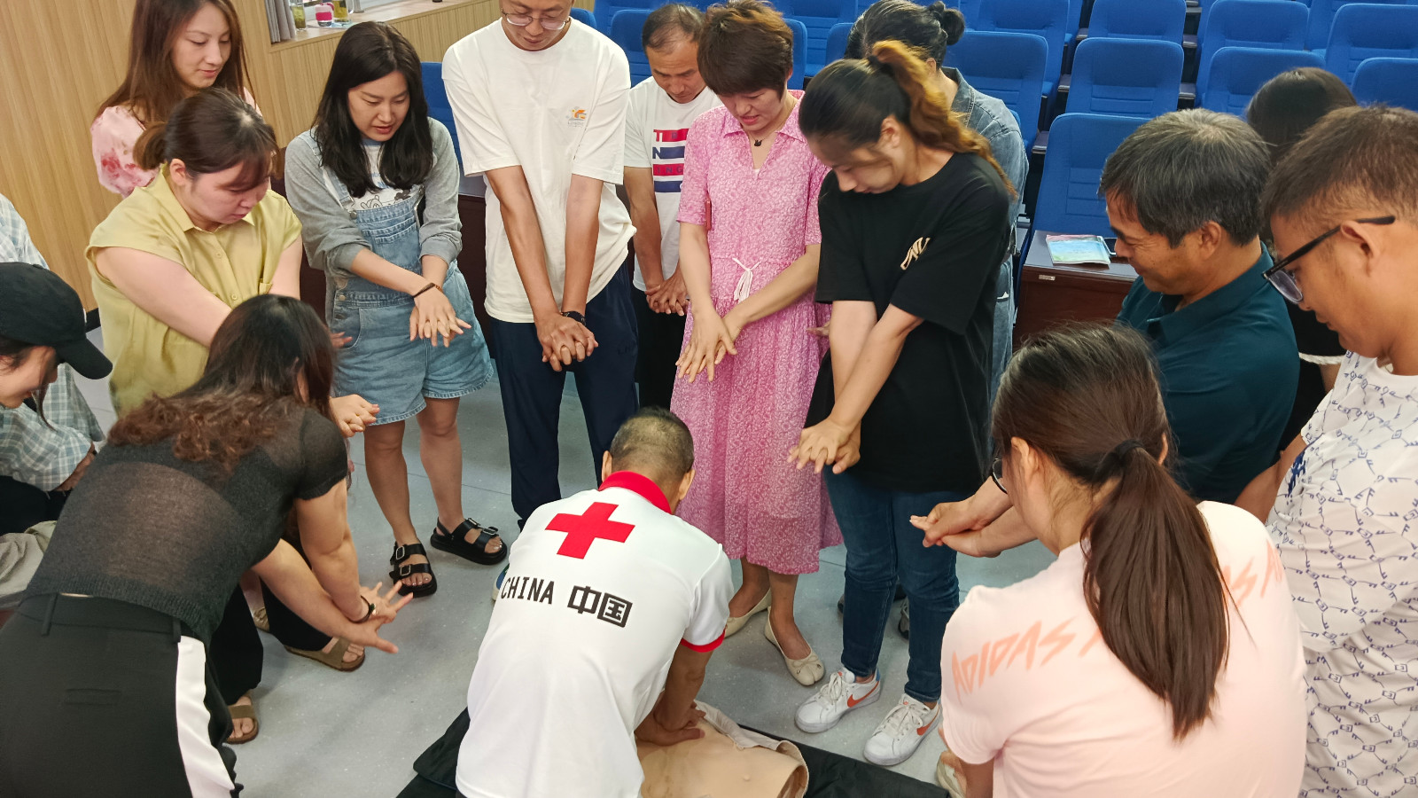 在上半场的培训中,讲师黄君君首先为大家科普了“三救”“三献”和红十字运动的起源等基本知识,介绍了一些日常生活中偶尔会遇到或听到的心跳骤停和气道梗阻等病症及其诱发原因,并通过多媒体视频里的真实案例,让大家了解到其危害和掌握急救知识与技能的重要性。黄君君还向大家重点传授了体外除颤仪的使用、心肺复苏术和海姆立克急救法等急救知识或相关技能。在模拟现场急救培训中,黄君君、赵小文将学员们分为两组,分别进行示范和指导,所有学员都亲手“上阵”进行急救训练。