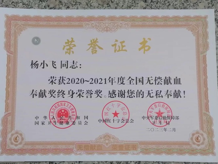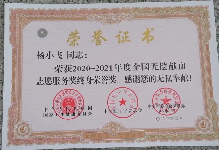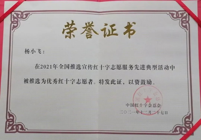 杨小飞共11次获得中国红十字会的表彰。溧水区红十字会常务副会长刘晓萍说,杨小飞用行动体现出来完美诠释“人道 博爱 奉献”红十字会精神。鉴于杨小飞在红十字会工作中的突出贡献,溧水区红十字会特聘他为“红十字形象大使”。
