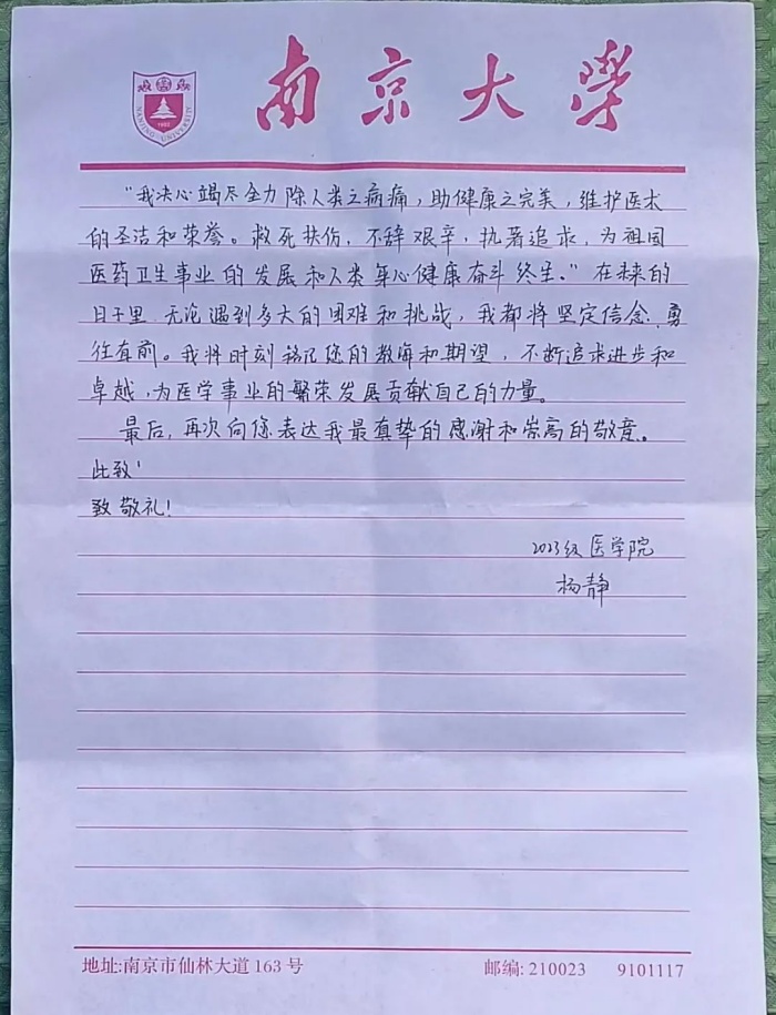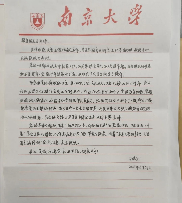 大学生们认真聆听捐友们的讲解,临别前为两个捐友家庭献上了一封赞美的信,他们表示,回校后将把老人们的善举在学生中传颂,宣传普及器官捐献理念,动员更多的人加入到这项伟大的事业中来。