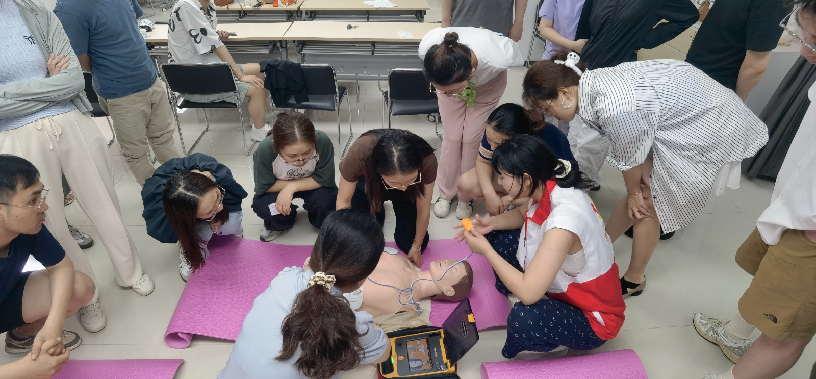 培训现场,红十字会应急救护师资邱老师结合现实生活,通过理论授课、操作演示和情景演练相结合的方式,深入浅出地讲解红十字知识,心肺复苏理论知识,并现场演示心肺复苏及自动体外除颤器(AED)和海姆立克使用的实操方法。