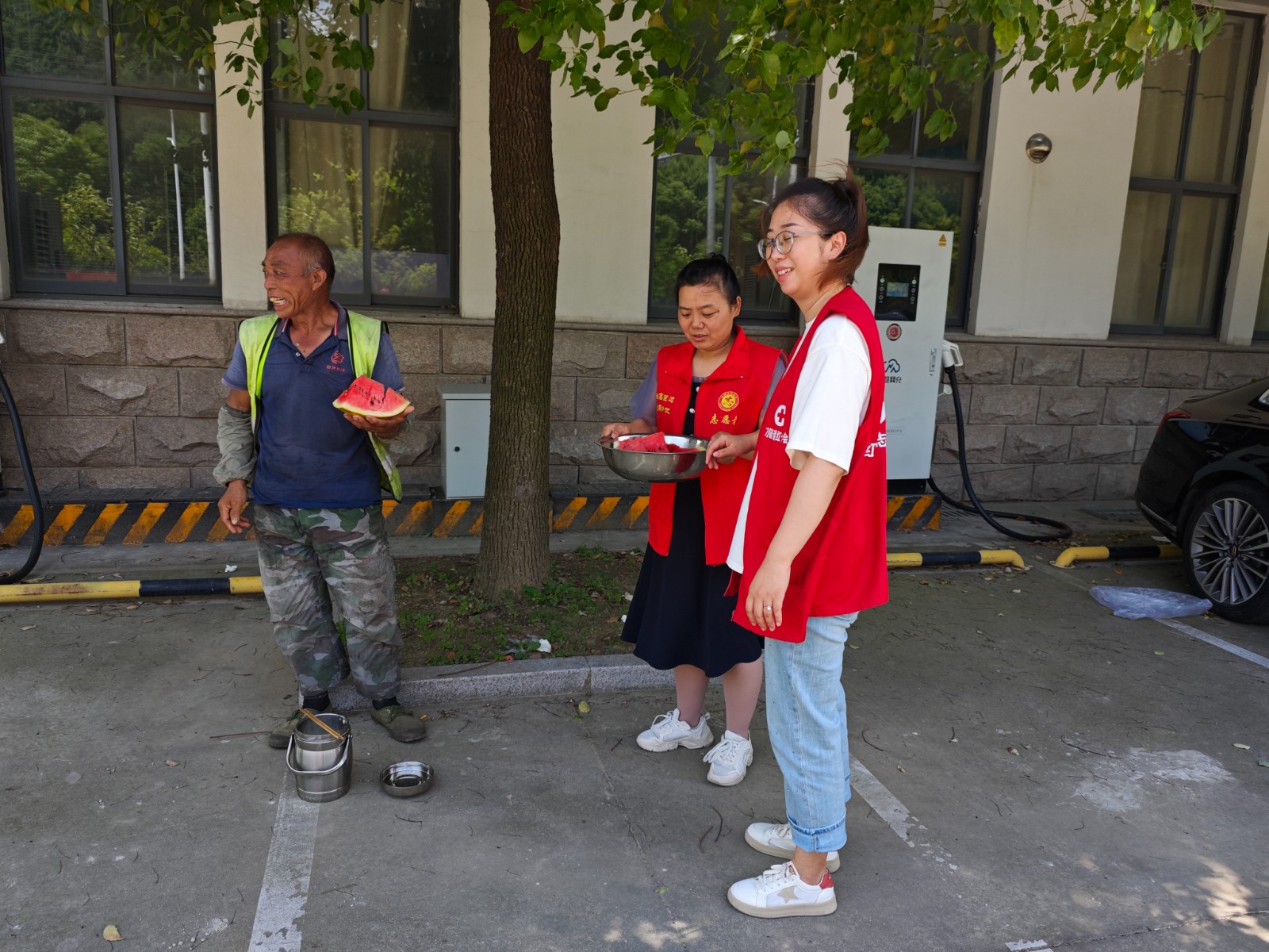 在活动现场,社区工作人员、红十字志愿者将西瓜和凉白开送到环卫工手中,并对在高温天气依然坚守一线的环卫工人表示深深的感谢,叮嘱他们在作业时注意身体安全、做好防暑措施。环卫工人们吃着清凉的西瓜说:“虽然干环卫工作非常辛苦,但是有社区、红十字会的关心,我们心里就很高兴,我们今后将更加努力干好本职工作。”